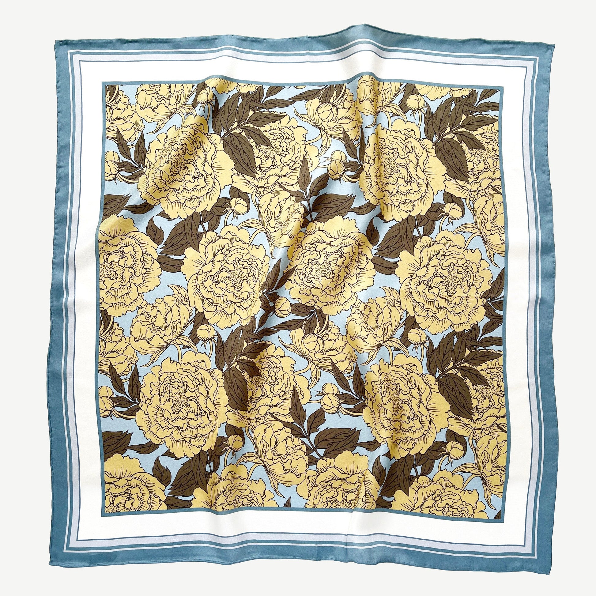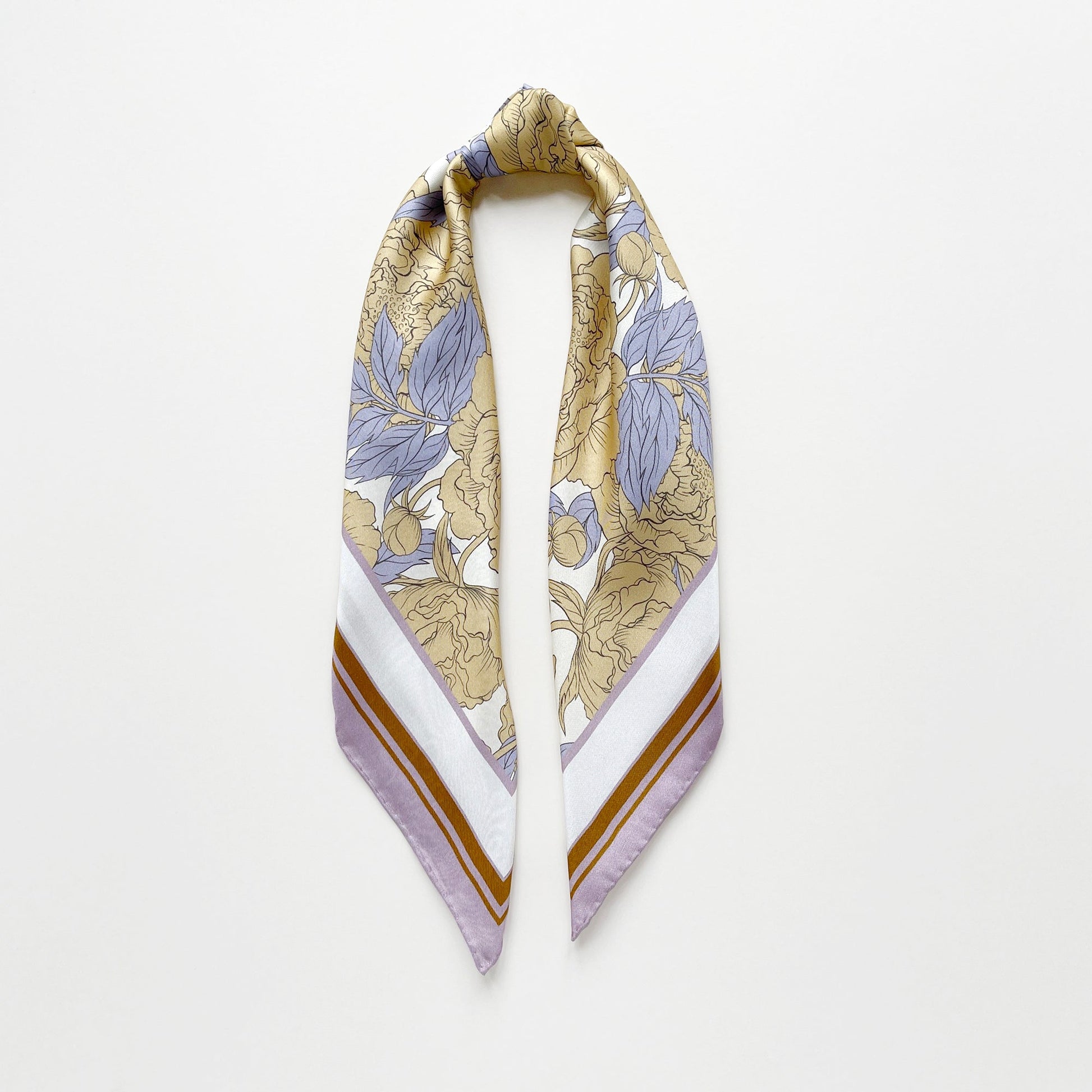 Wrap yourself in blooming elegance with this 65cm silk scarf, beautifully printed with delicate peony flowers. The soft, vintage-inspired colour palettes—one framed with dusty blue, the other with lilac and ochre—add a refined touch to any look.