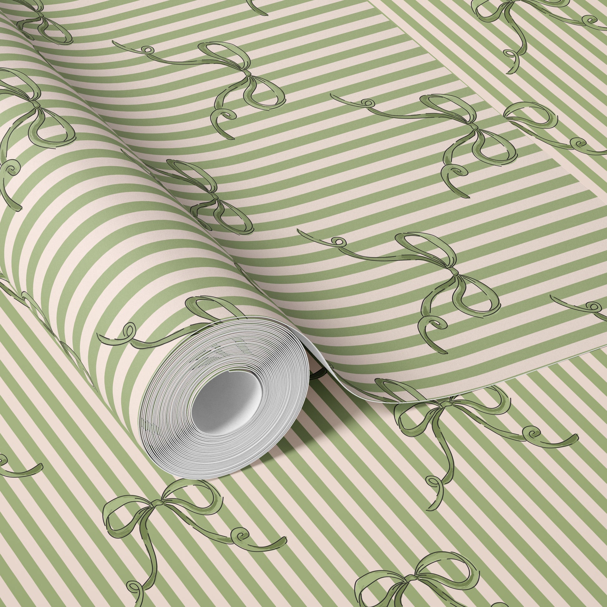 Wrap your walls in the gentle elegance of our Pirouette Soft Moss Wallpaper, a soft green backdrop entwined with whimsical ribbon-like bows. Elevated yet effortlessly charming, it adds a dreamy, vintage-inspired touch to nurseries, powder rooms, or cosy reading corners.