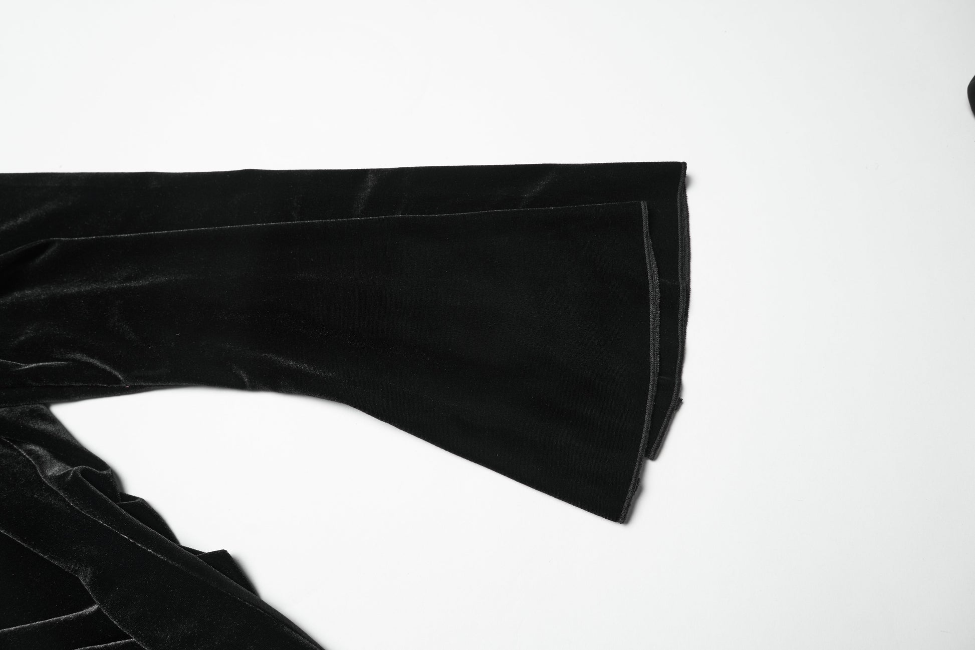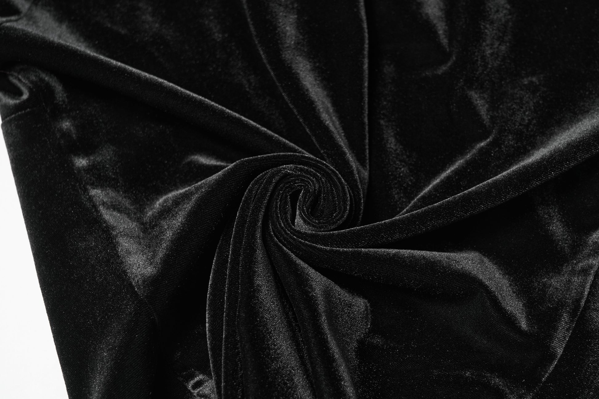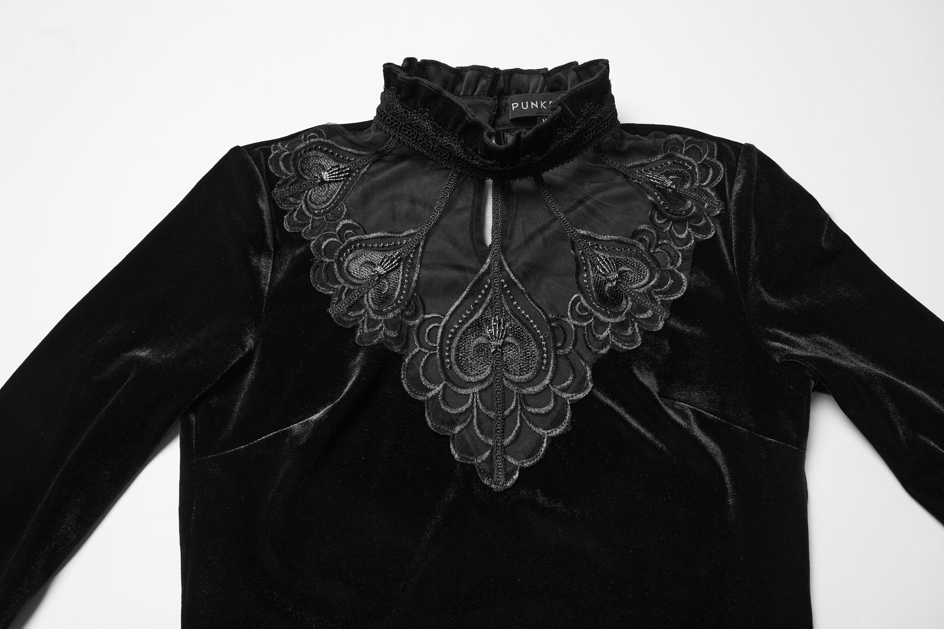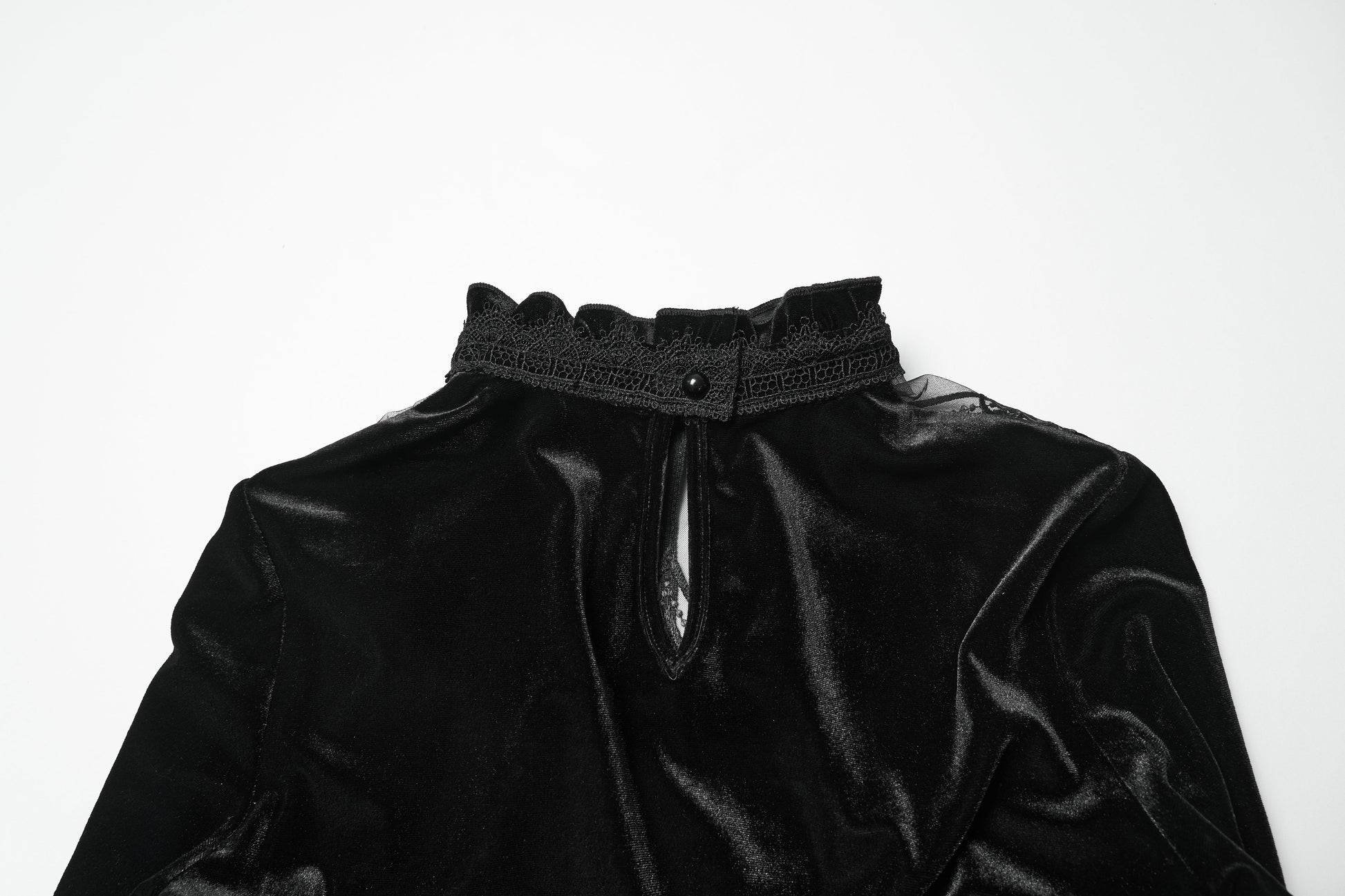 Super-soft black velvet with a romantic stand-up ruffle collar