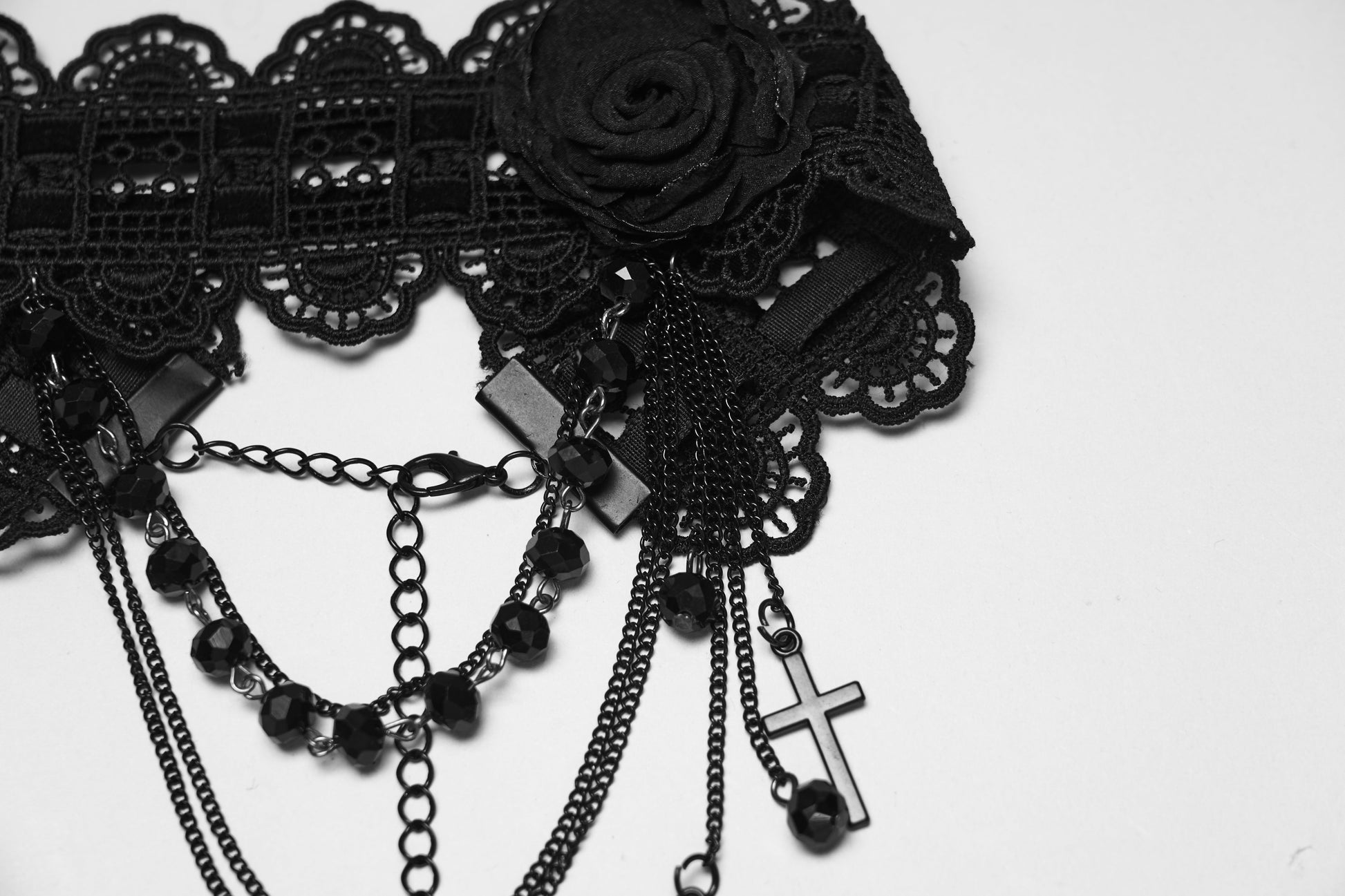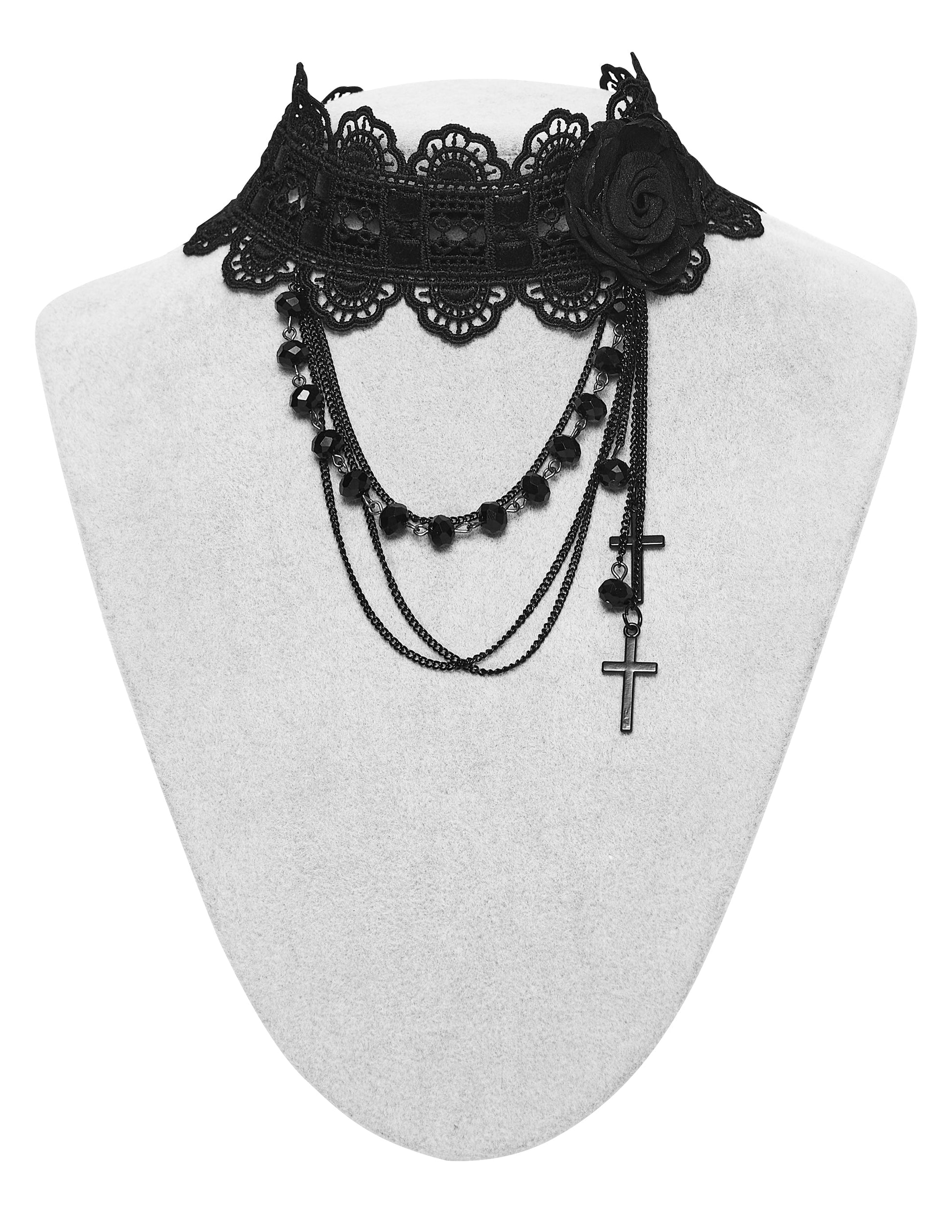 Complete your gothic ensemble with the exquisite Punk Rave Melinoë Beaded Choker. Designed with lace, chains, and a dramatic black rose – it's a wearable work of art.