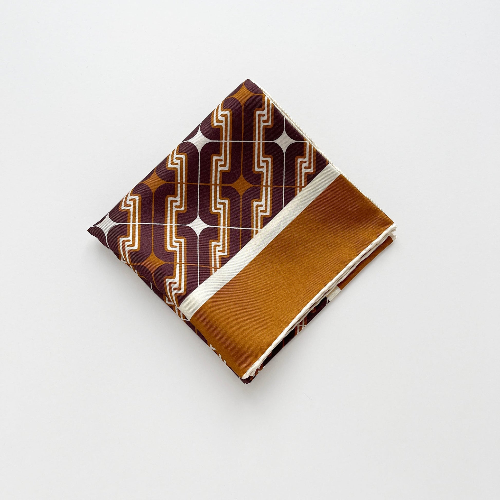 Calling all '70s enthusiasts! Embrace timeless sophistication with our 70s-style geometric silk scarf. In a rich palette of burgundy, Carnaby tan, and beige, this versatile accessory adds vintage charm to any outfit. Crafted from 100% premium silk twill with hand-rolled hems, this luxurious piece blends retro elegance with modern flair. Perfect for both special occasions and everyday sophistication.