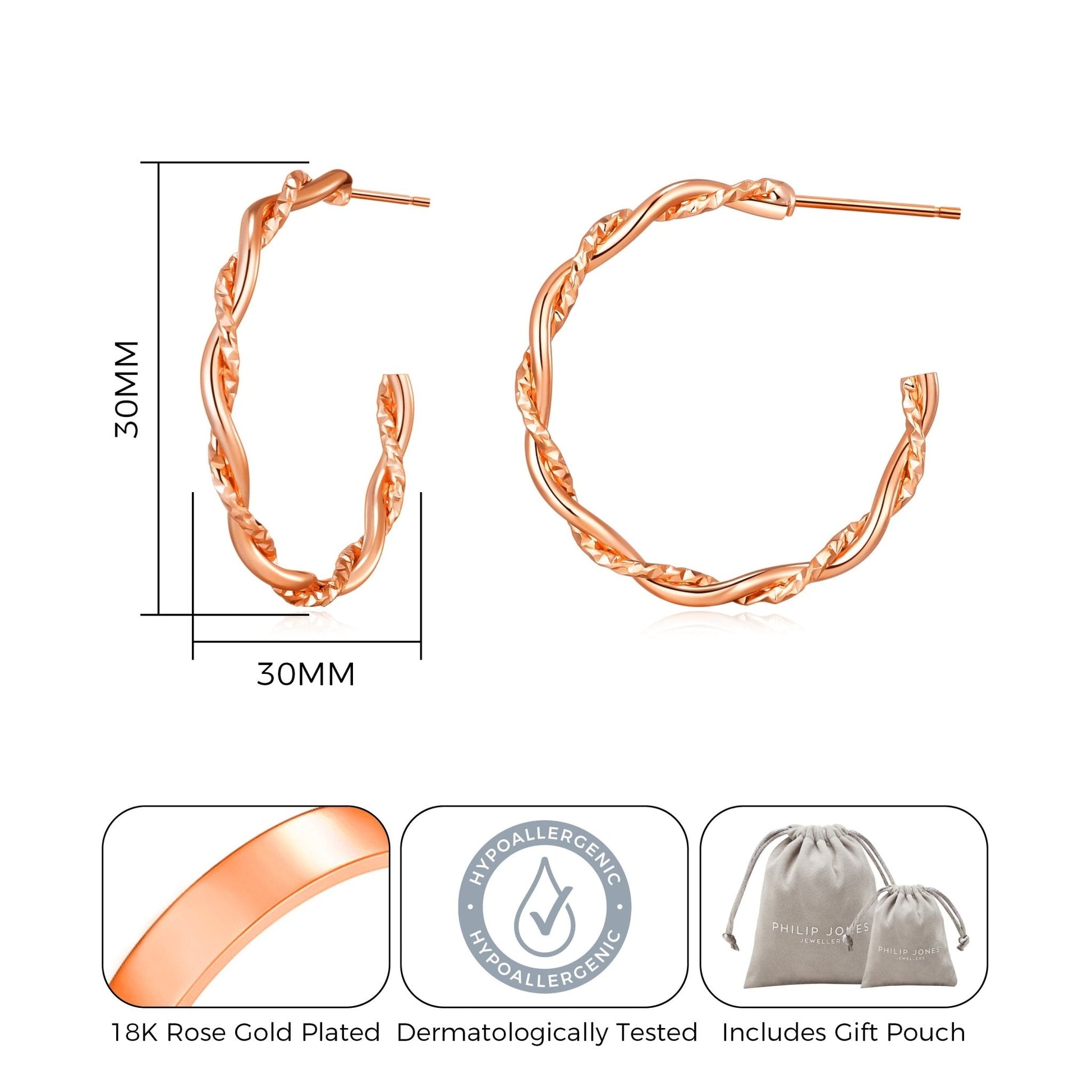 Add some sparkle to your style with these expertly crafted rose gold plated 30mm twisted diamond cut hoop earrings. Hypoallergenic and with a high polished diamond cut finish, they're the perfect accessory for any outfit. Comes with a gift pouch for easy gifting. Shine on!