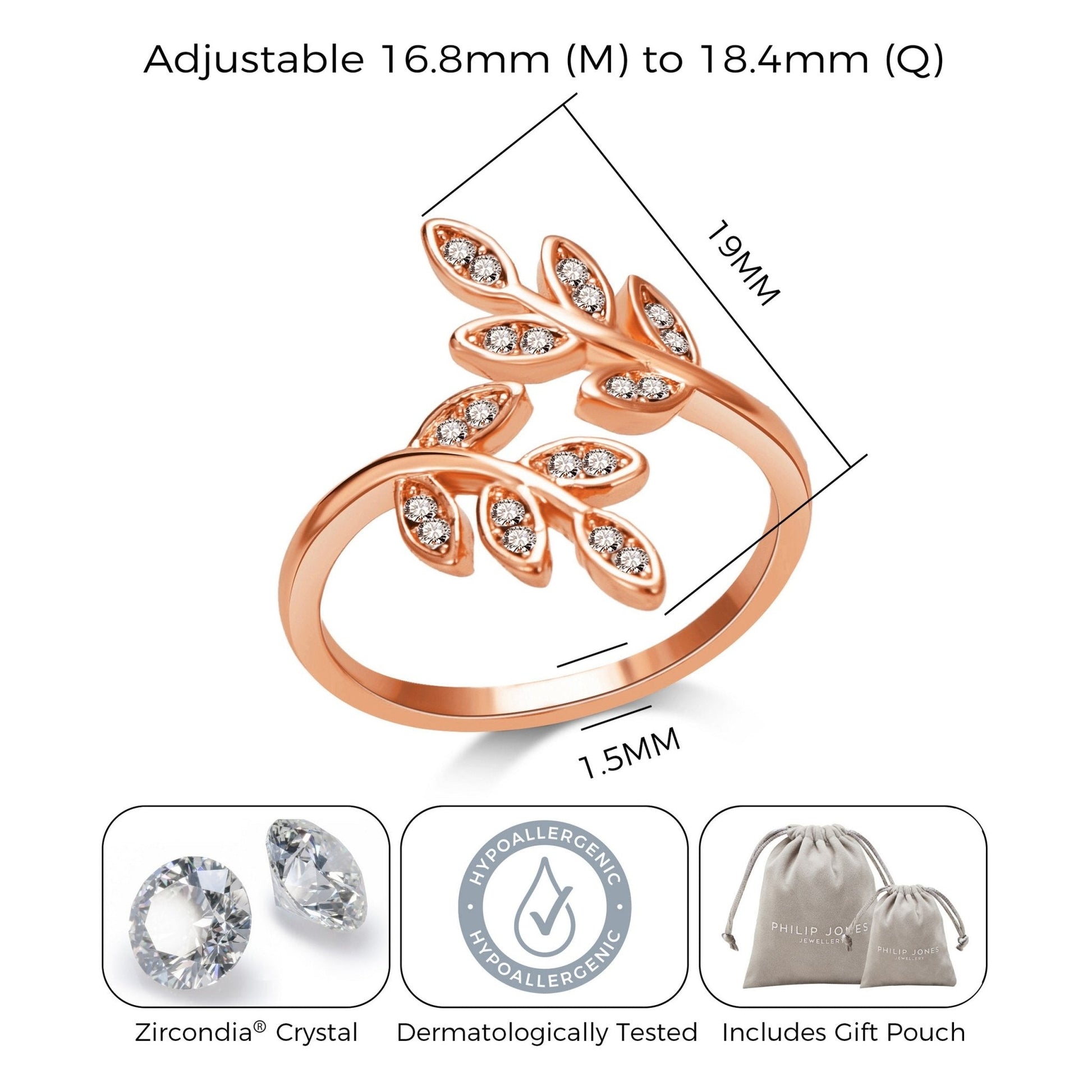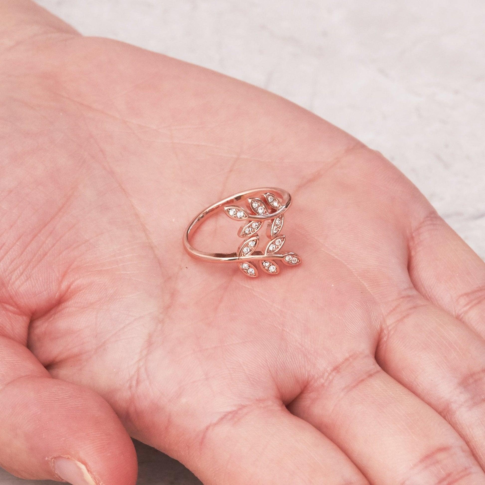 Indulge in luxury with our Rose Gold Plated Adjustable Leaf Ring. This stunning piece is created with Zircondia® Crystals for a touch of sparkle. Hypoallergenic and crafted with care, it's perfect for everyday wear. Feel confident and stylish with the adjustable size and elegant wrap design. Includes a gift pouch for easy gifting.