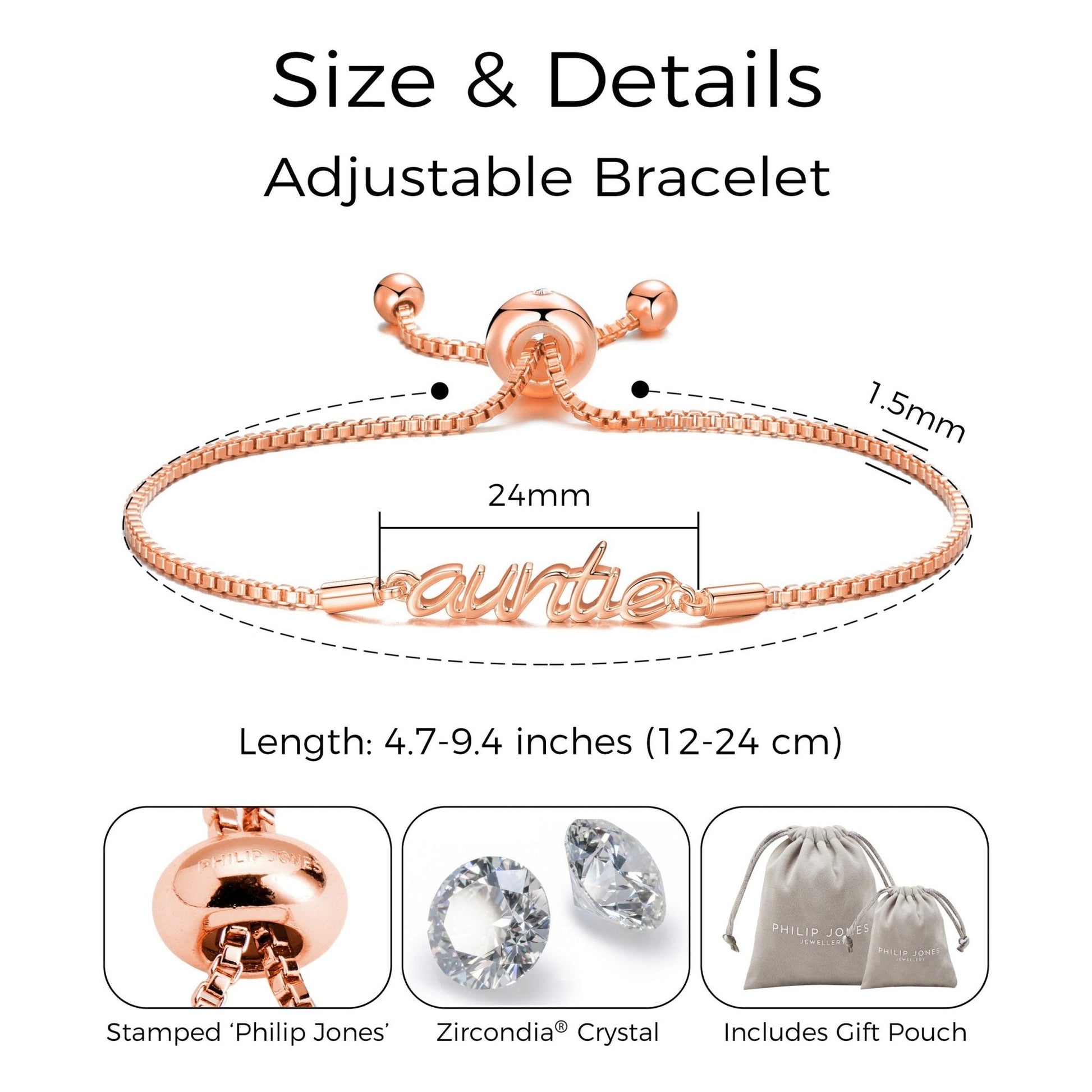 Designed by Philip Jones, this rose gold-plated brass alloy bracelet features an auntie charm measuring 10mm (H) by 24mm (L). The bracelet is adjustable from 12cm to 24cm and securely fastens via a slider closure. It is set with 1mm round Zircondia® crystals, weighing 5.89g.