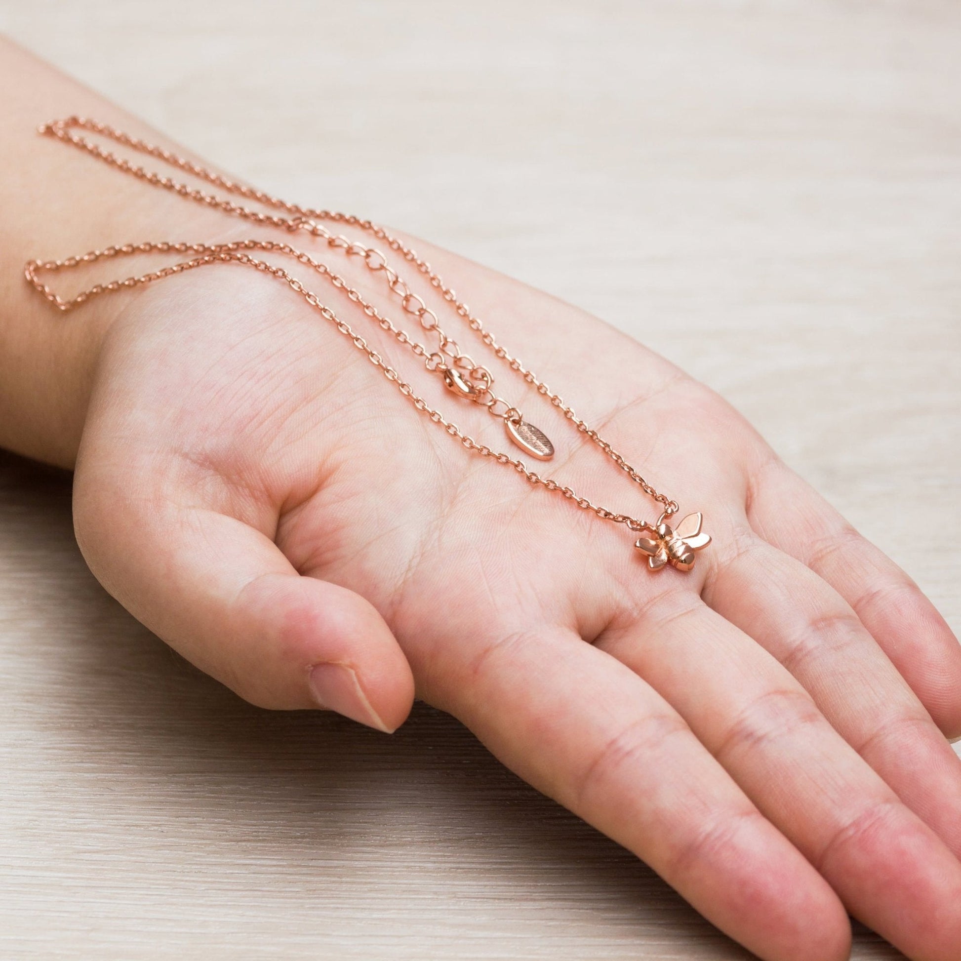 Liven up your look with this exquisite rose gold plated bumble bee necklace from Philip Jones. Crafted with a striking brass alloy, the pendant has dimensions of 10mm (H) x 12mm (W) and it is connected to a 43cm cable chain with a 5cm extender. This 2.4g necklace is secured with a lobster claw closure.