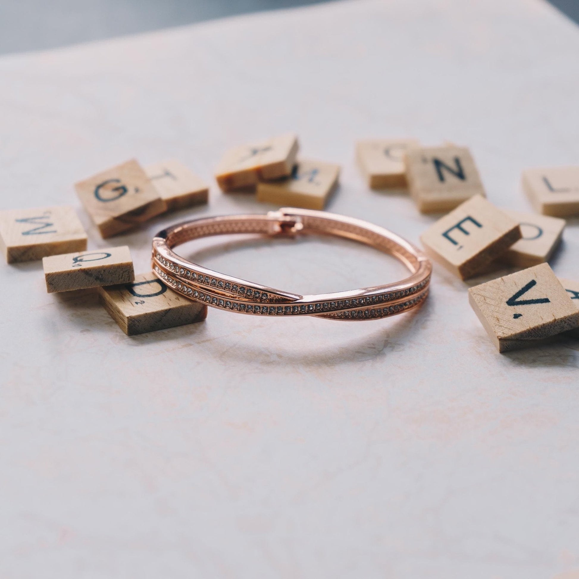 Rose Gold Plated Crossover Bangle Created with Zircondia® Crystals (7 Inch)