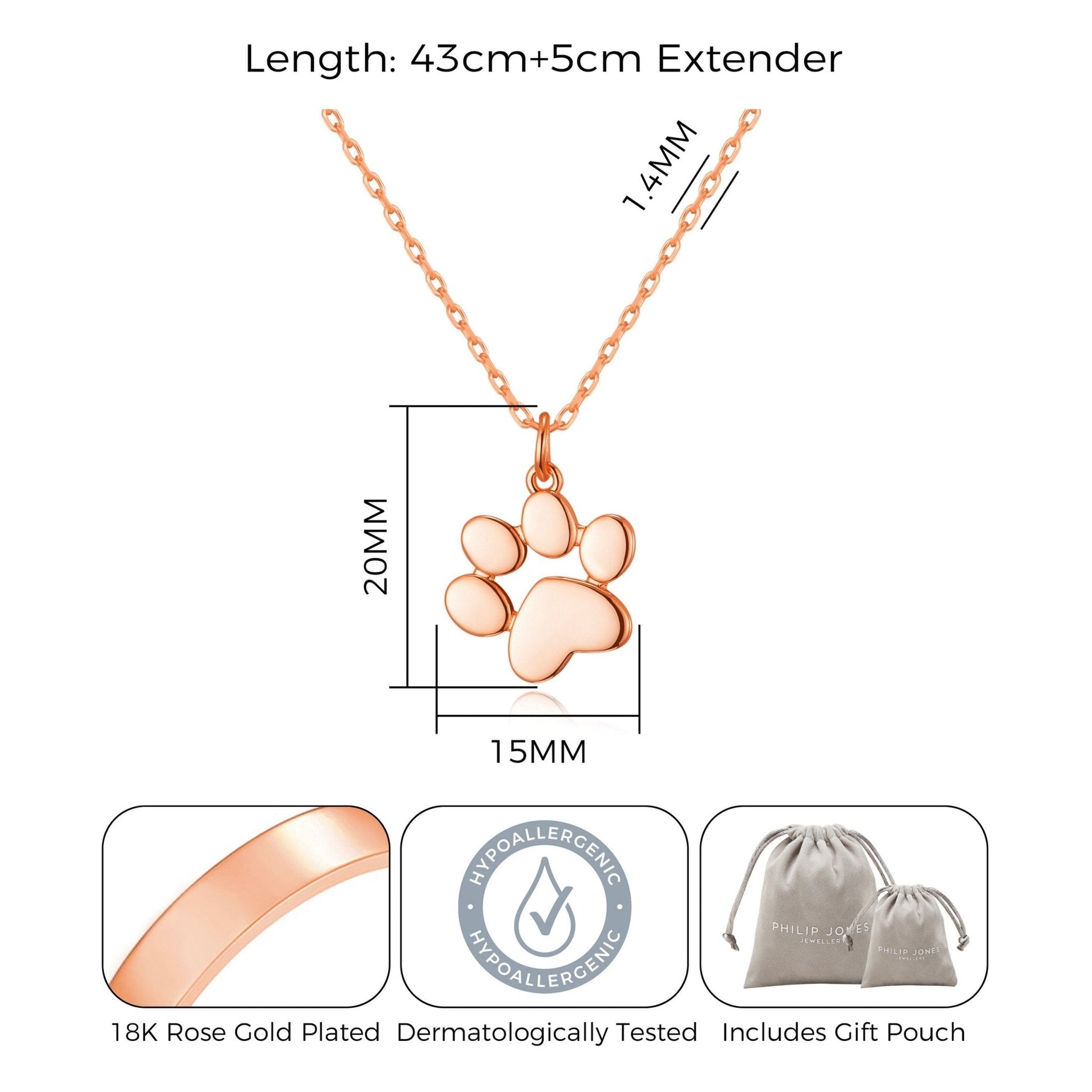 Glimmer and shine with this Rose gold-plated dog paw necklace! Its polished finish and hypoallergenic brass alloy make it a must-have accessory. From Philip Jones, the necklace features a 20mm (H) x 15mm (W) pendant on a 43cm + 5cm extender cable chain with a lobster claw closure. Packaged in a gift pouch, it's sure to make a statement.
