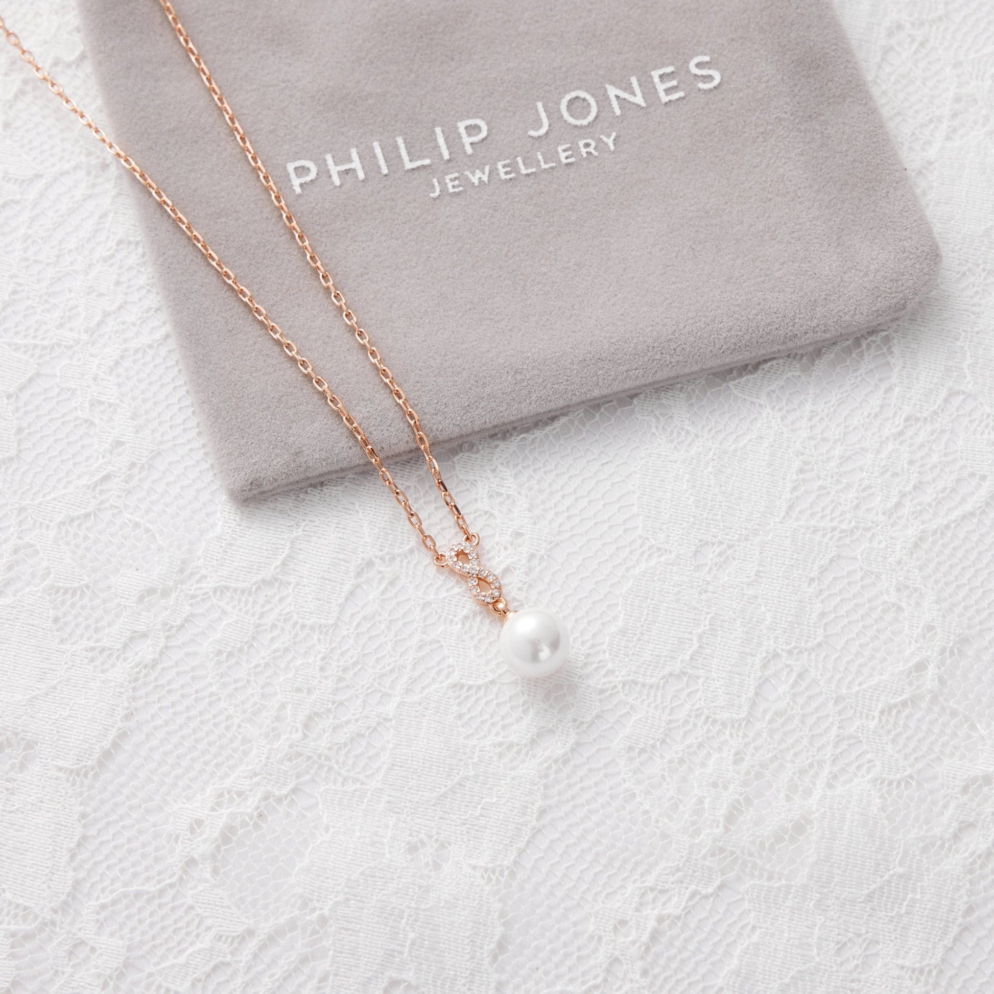 This rose gold plated pendant necklace, adorned with sparkling Zircondia® crystals and a radiant white shell pearl, is the perfect accessory for weddings. Designed for brides, bridesmaids, and bridal celebrations, its elegant infinity drop symbolizes everlasting love. The 21mm by 8mm pendant hangs on a 43cm cable chain with a 5cm extender, secured by a lobster claw clasp for a comfortable fit. Hypoallergenic and crafted by Philip Jones, it comes beautifully packaged in a gift pouch with a heartfelt quote card, making it an ideal wedding or bridal gift she will treasure.