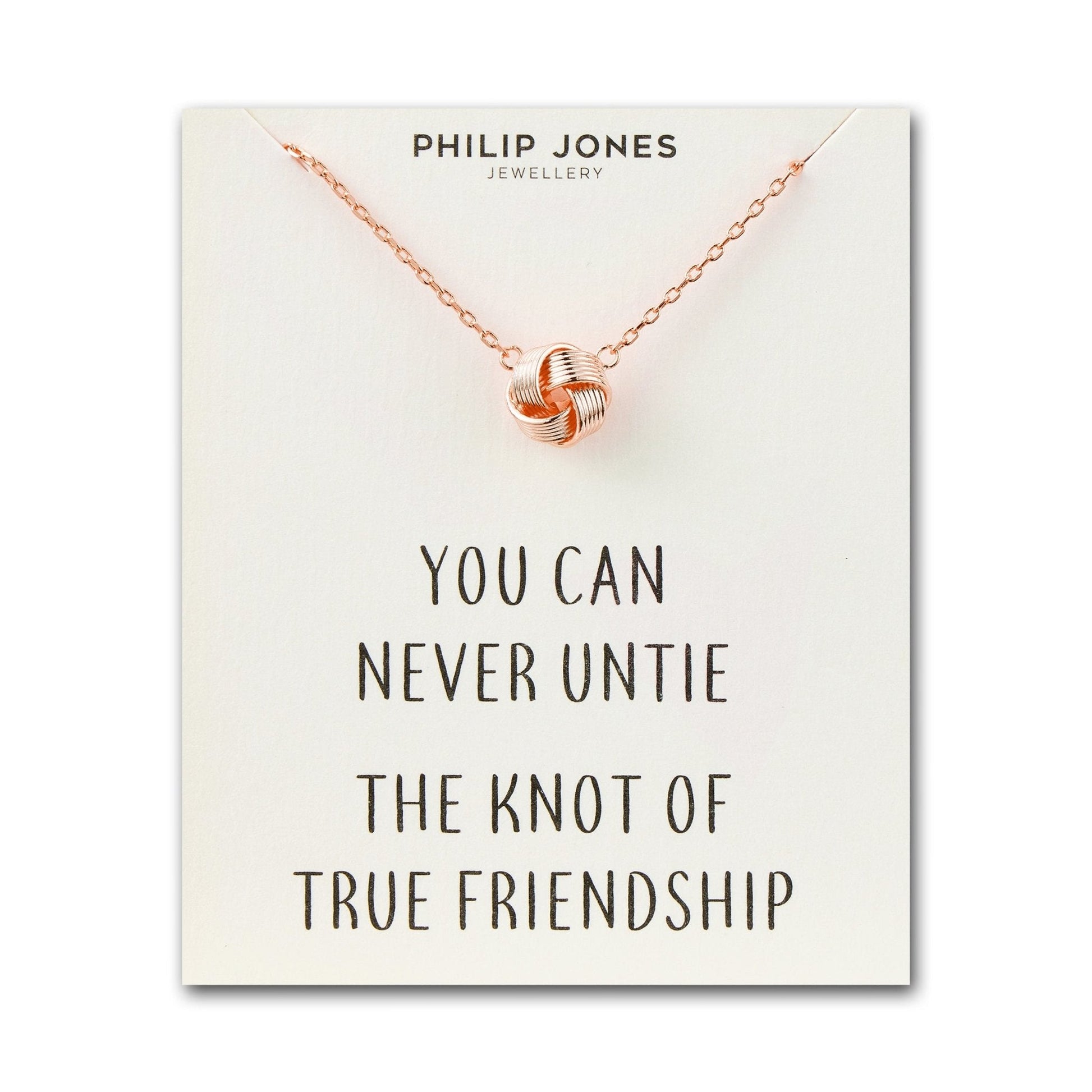 Elevate your style with Philip Jones' Rose Gold Plated Love Knot Necklace! The high polished finish adds a touch of elegance, while the hypoallergenic brass alloy ensures comfort. The included quote card and gift pouch make it a perfect present for yourself or a loved one. Measure your love at 10.5mm (H) x 10.5mm (W) and extend it with 43cm + 5cm Extender chain.