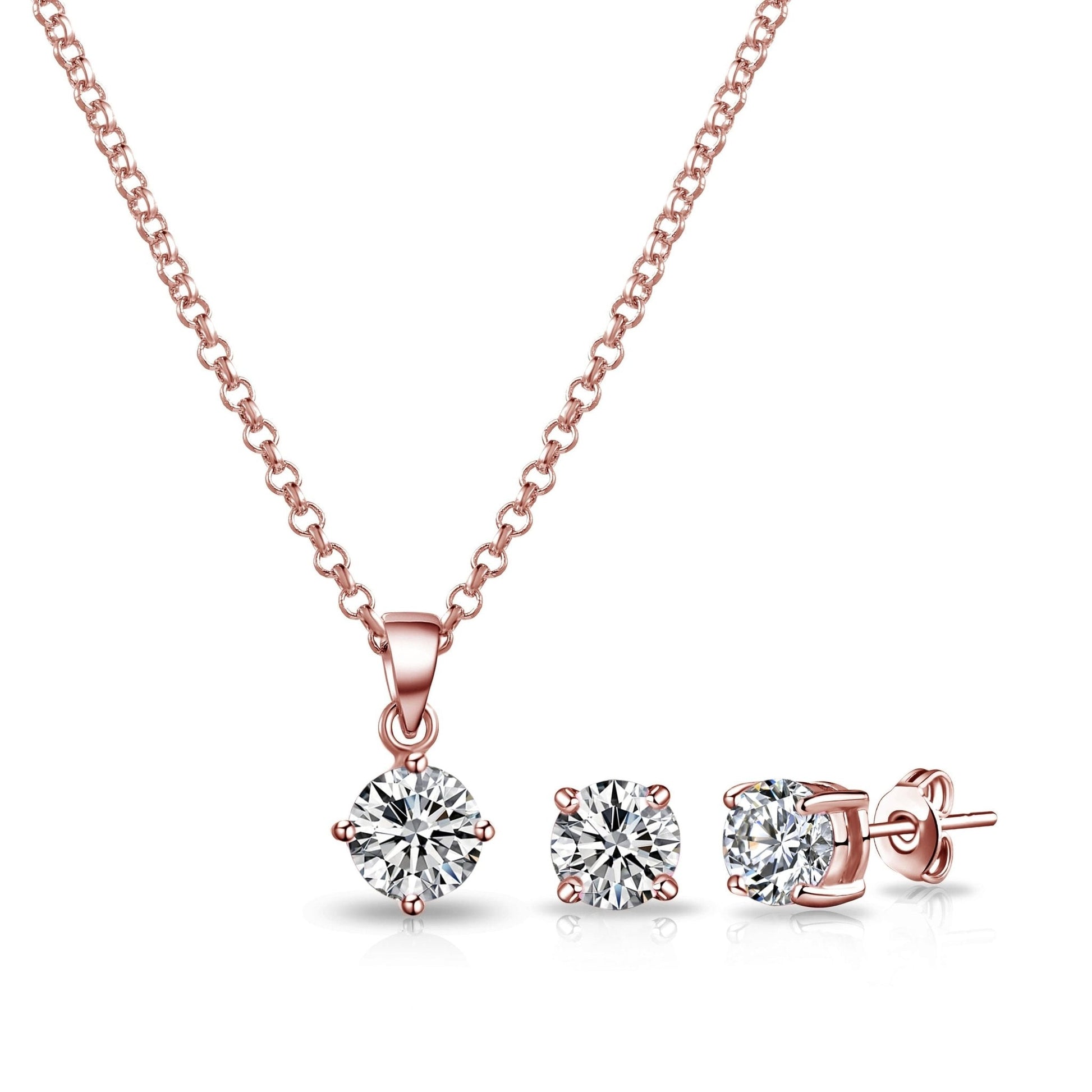 This Philip Jones Rose Gold Plated Brass Alloy piece features a pair of stud earrings with 5mm Zircondia® crystals in a round shape and clear hue. 2 crystals of this size are included. The closure type is butterfly, and the total weight of the earrings is 1g. The pendant is 6mm in height and width, with a single round 6mm Zircondia® crystal in clear and a lobster claw closure. The cable chain is 43cm with an additional 5cm extender, and the total weight of the necklace is 3.6g.