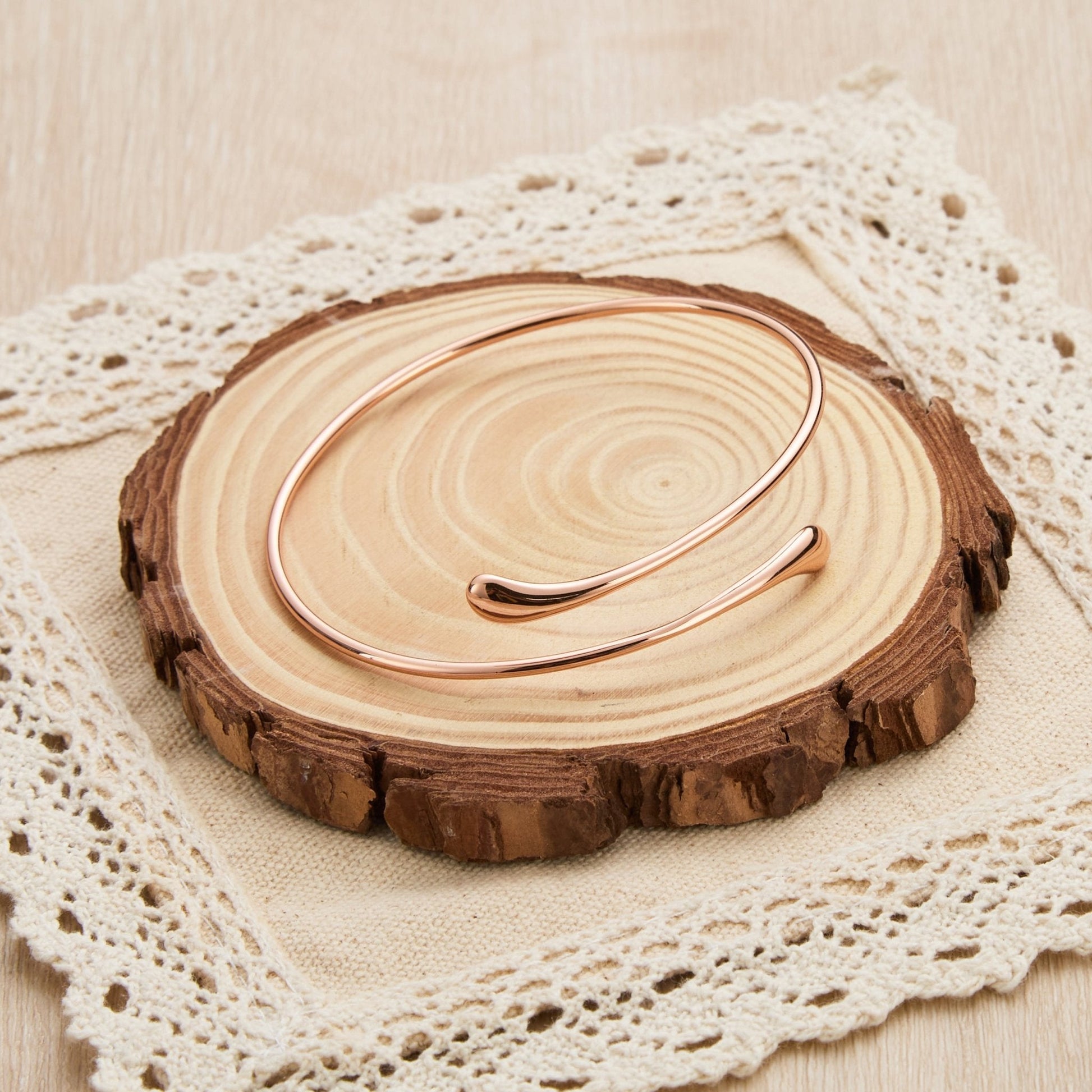 Elevate your wrist game with our Rose Gold Plated Teardrop Bangle! Crafted with hypoallergenic brass alloy and a high-polished finish, it's both stylish and gentle on your skin. With a stretchy cuff closure and a weight of 8.7g, it's comfortable and easy to wear. Comes in a convenient gift pouch.