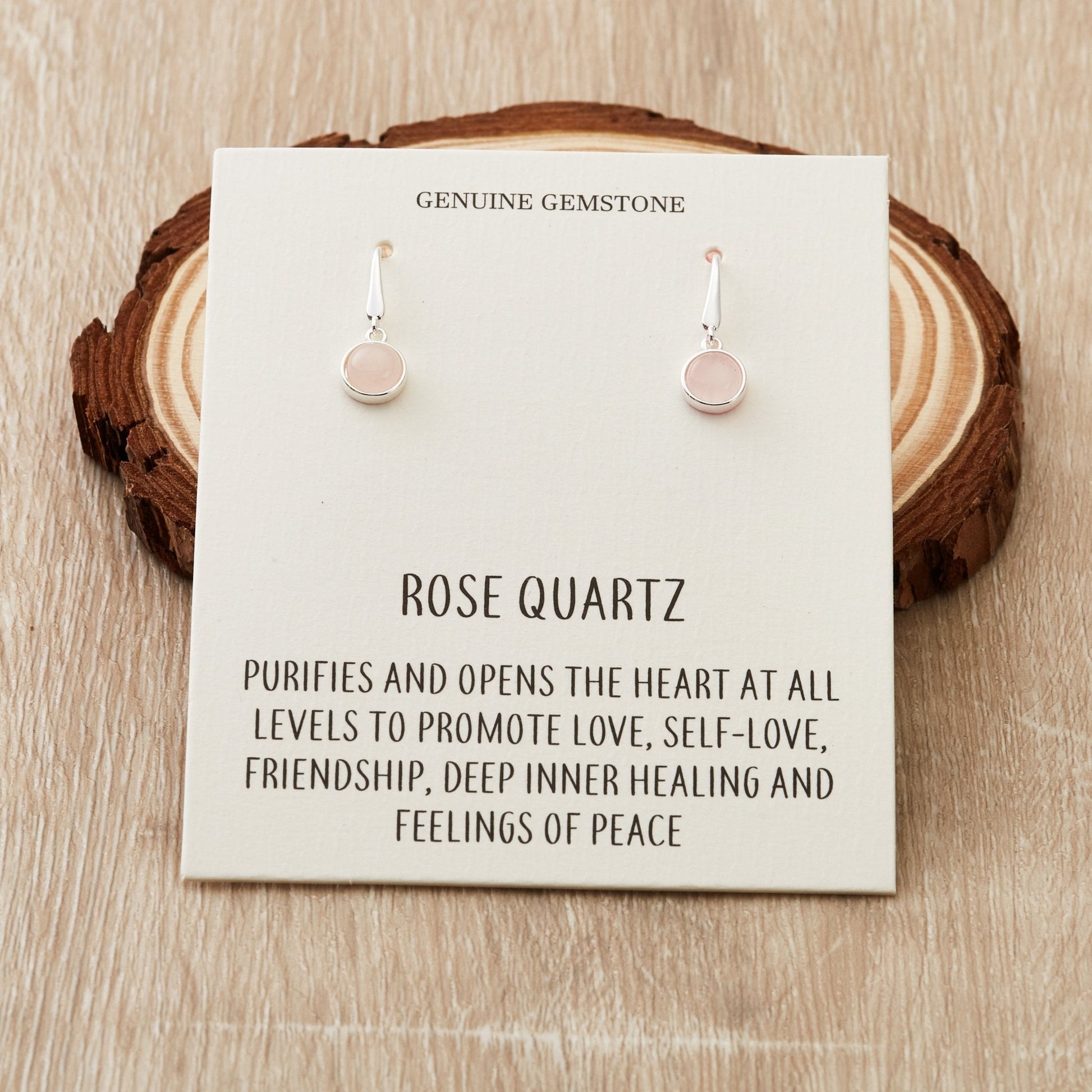 Philip Jones presents silver-plated brass alloy drop earrings, measuring 20mm x 7mm and weighing 1.9g. The featured stones are 6mm round rose quartz with a pink hue. A French hook securement ensures the earrings are held securely in place. Two earrings are included in each set.