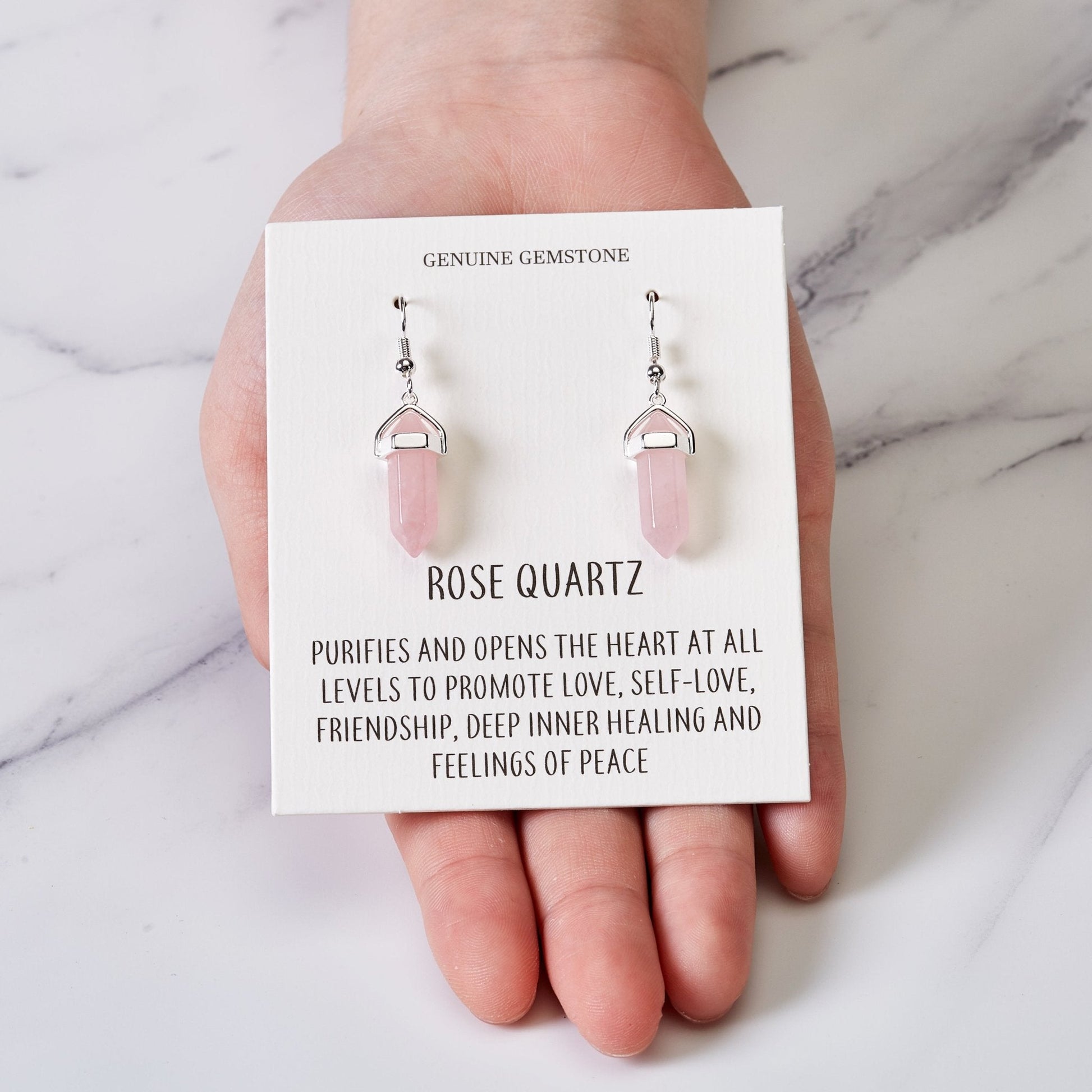 Rose Quartz Gemstone Drop Earrings with Quote Card