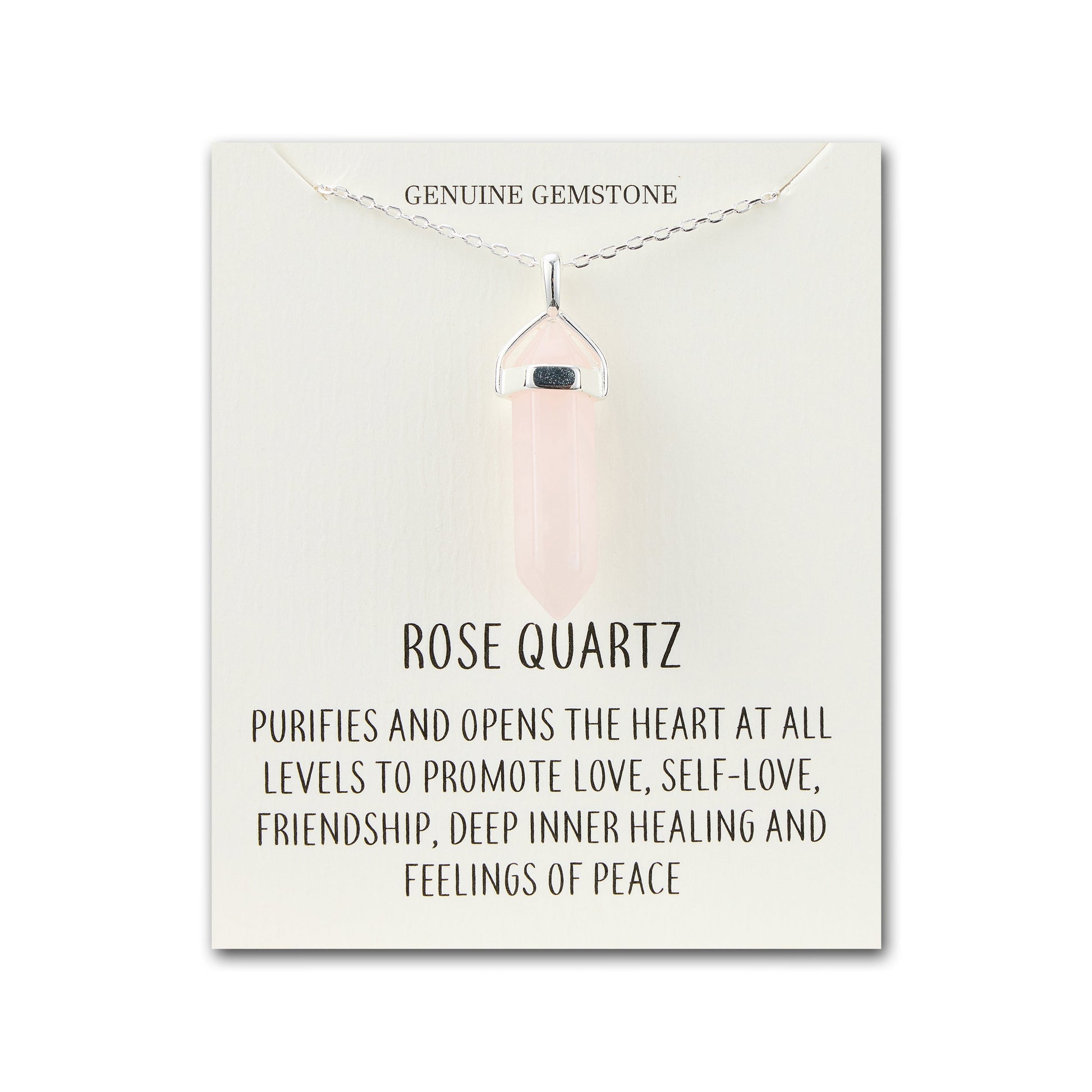 This stunning Philip Jones pendant features a unique, pink rose quartz cylinder-shaped stone atop a beautiful silver plated, brass alloy necklace. Its dainty dimensions of 42mm (H) x 9mm (W) and a length of 43cm plus an extender of 5cm makes it a perfect piece. The stylish cable chain is finished with a lobster claw closure and this design weighs just 6.5g.