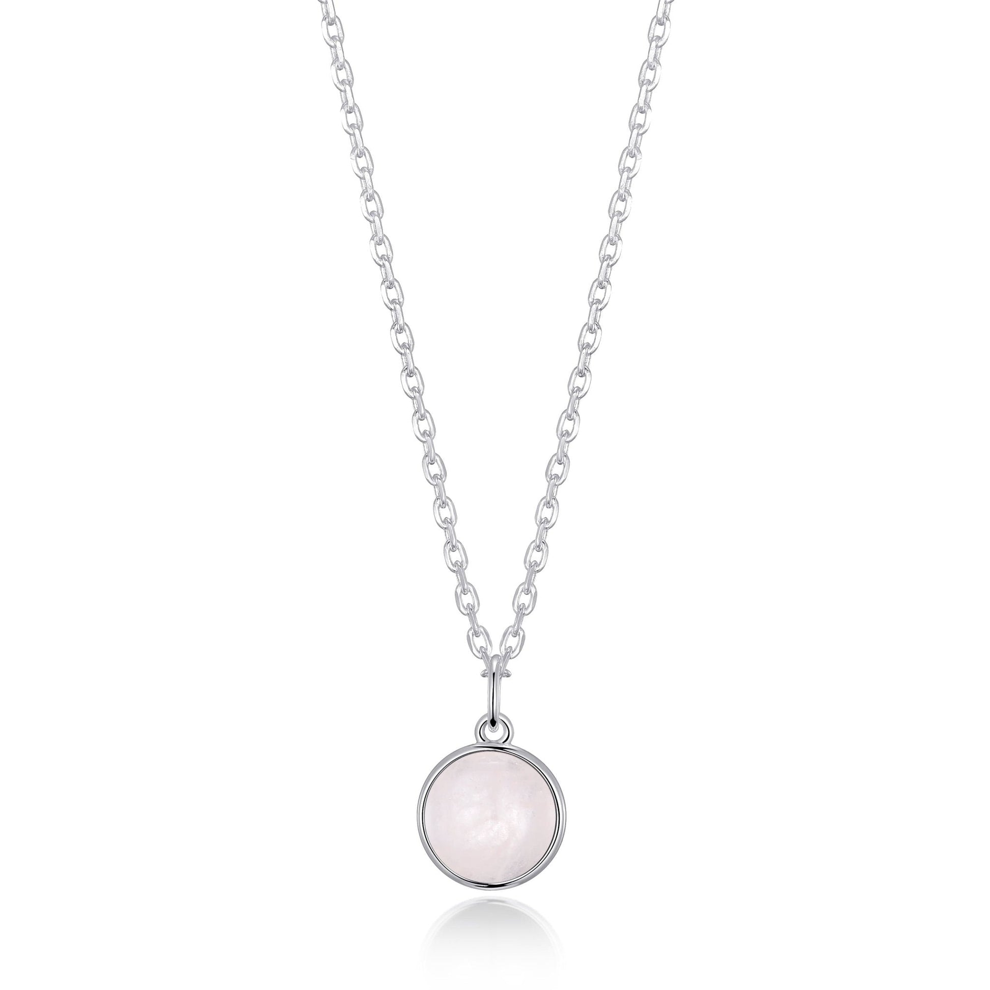 This Rose Quartz Necklace with Quote Card is crafted from a brass alloy, plated with silver. It features a round pendant measuring 9.5mm (height) by 9.5mm (width), attached to a 43cm cable chain with a 5cm extender and lobster claw closure. The pink rose quartz stone has a 9mm diameter and weighs 3.48g. It is crafted by Philip Jones.
