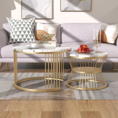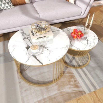 ② SET of 2 DESIGN The coffee table set includes a large coffee table 70*70*45cm and a small coffee table 45*45*40cm. A small coffee table can be placed under the bigger coffee table. You can combine them as you like. MODERN DESIGN This nested tables set is not only functional but stylish too. The chic, minimalist aesthetic is sure to be a highlight in your living room. Humanized Design for Better Experience Compared to those rectangular tables, our end table set is safer to use, which is designed with round corner to prevent bumping accidentally. Several adjustable foot pads help the tea table keep stable on uneven floors, protect ground from scratches and reduce noise when moving. Elegant Nesting Coffee Table Set Combined with marble-patterned tabletop Not marble, not slat and gold metal frame, the nest of table is characterized by its minimalist design and simple structure, which perfectly matches any style of room decoration and adds elegance to your room. It will be a perfect addition to your home, such as as living room, bedroom, study, small apartment, etc. and is ideal for study, work, dining and leisure. Sturdy & Durable Construction The coffee table set is constructed of solid mental frame, ensuring high stability for long-lasting use. Meanwhile, the tables feature high quality MDF tabletop, which is wear-resistant and durable. Besides, firm connection enhances the overall sturdiness. Easy Assembly and Cleaning We will provide all necessary accessories and detailed instruction to shorten your assembly time. You can just finish the installation without efforts. In addition, smooth and flat surface is easy to clean and maintain, just using a damp cloth to wipe it.