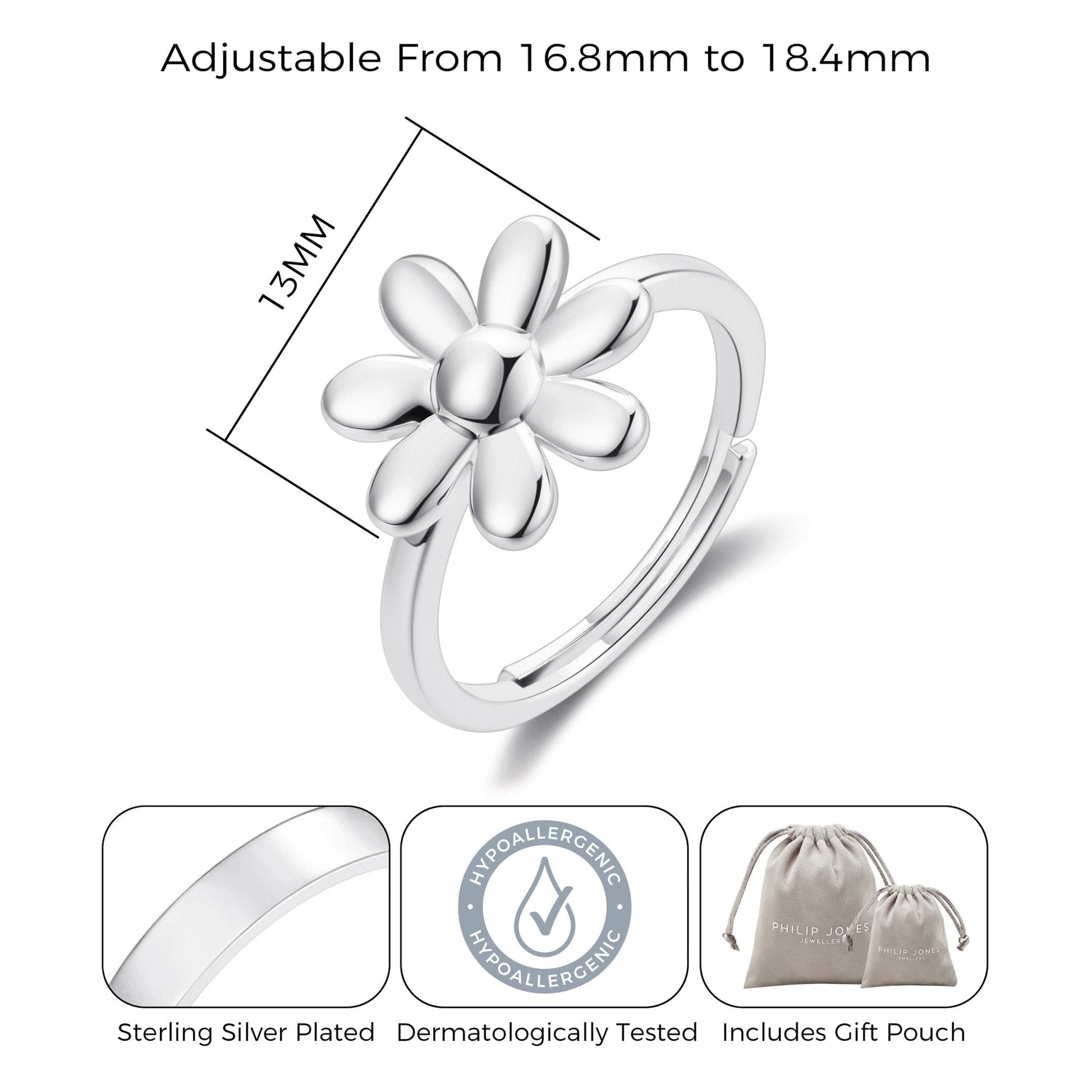 This adjustable daisy ring from Philip Jones boasts a silver-plated, high-polish finish that is both stylish and hypoallergenic. Made from a brass alloy base, the delicate daisy measures 13mm. The ring adjusts comfortably between sizes 16.8mm and 18.4mm, featuring a slender 2mm band. It arrives beautifully packaged in a gift pouch measuring 7cm by 5cm, making it an ideal gift or personal treat.