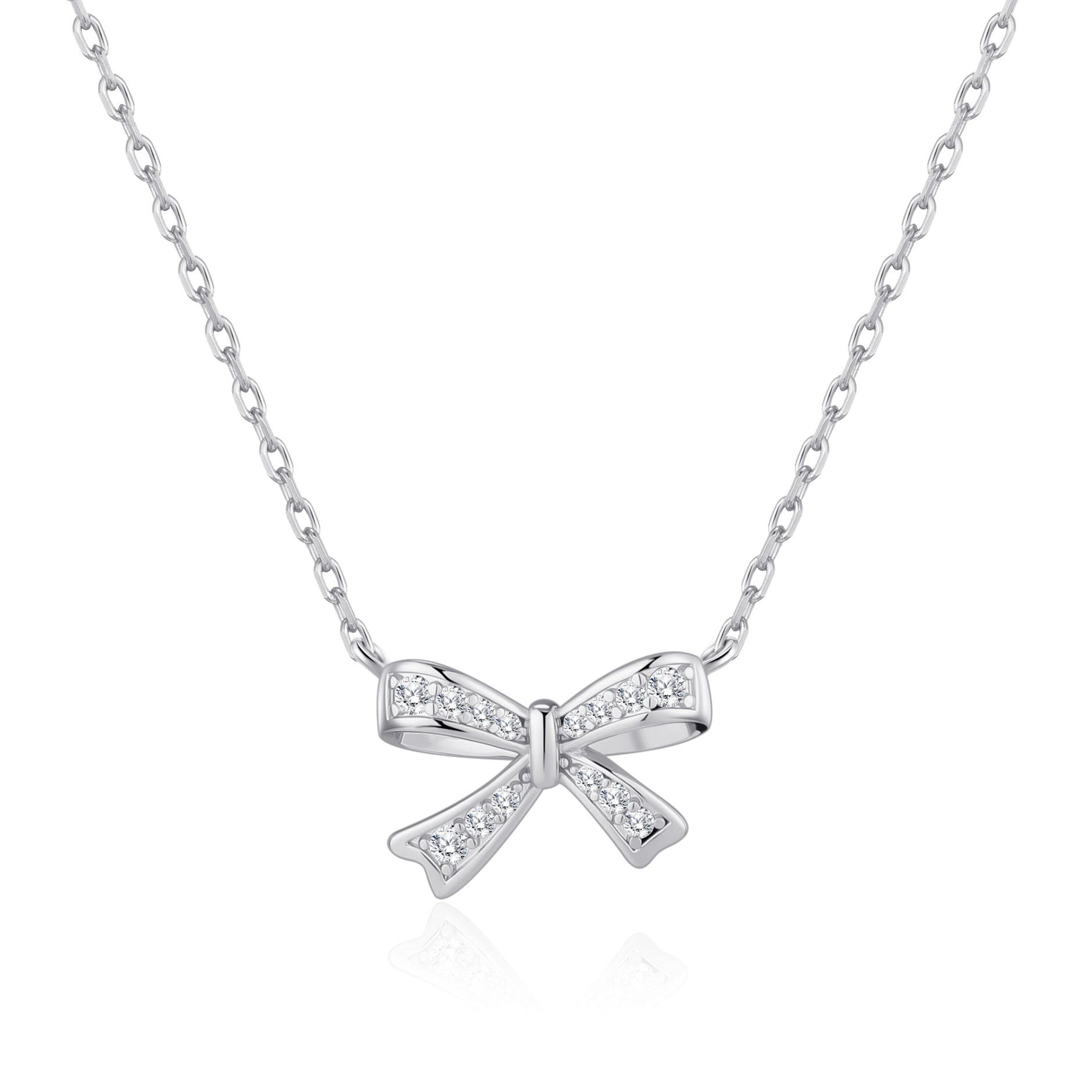 Elevate your style with this elegant Silver Plated Bow Necklace, adorned with sparkling Zircondia® crystals. Crafted from hypoallergenic silver-plated brass alloy, it offers both beauty and comfort. The delicate 10mm by 13mm pendant hangs gracefully on a 43cm cable chain with a 5cm extender, secured by a lobster claw clasp for a perfect fit. Lightweight at just 3.49g, this necklace features eleven shimmering 1mm white crystals that catch the light beautifully. Presented in a stylish gift pouch, it makes an ideal gift or a stunning addition to your own collection.