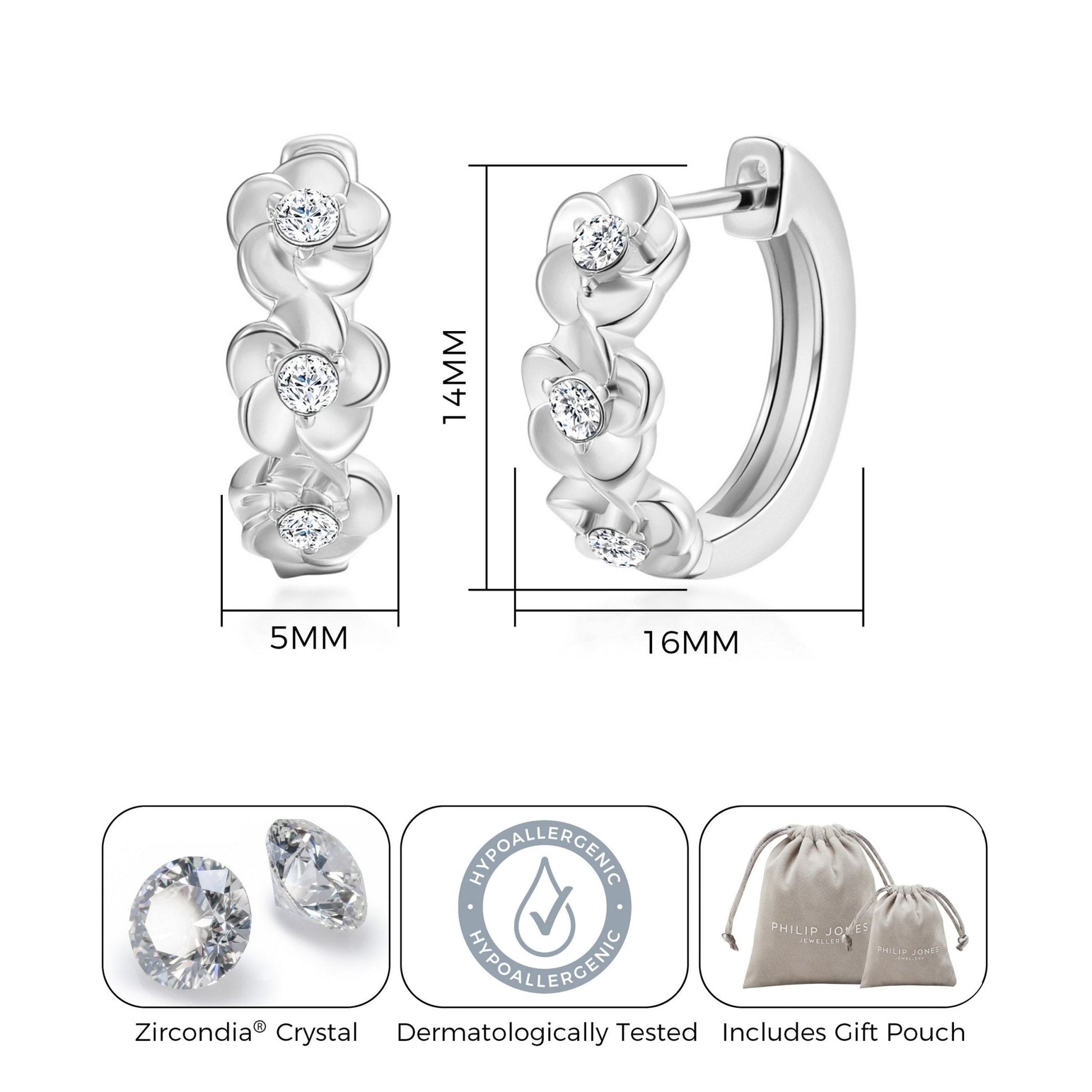 These Silver Plated Flower Hoop Earrings from Philip Jones offer an elegant and timeless look. Crafted with durable brass alloy and plated with sterling silver, they feature huggie closures and are adorned with 6 round Zircondia® crystals for a sparkling finish. The earrings measure 14mm (H) x 16mm (W) and weigh 2.6g.