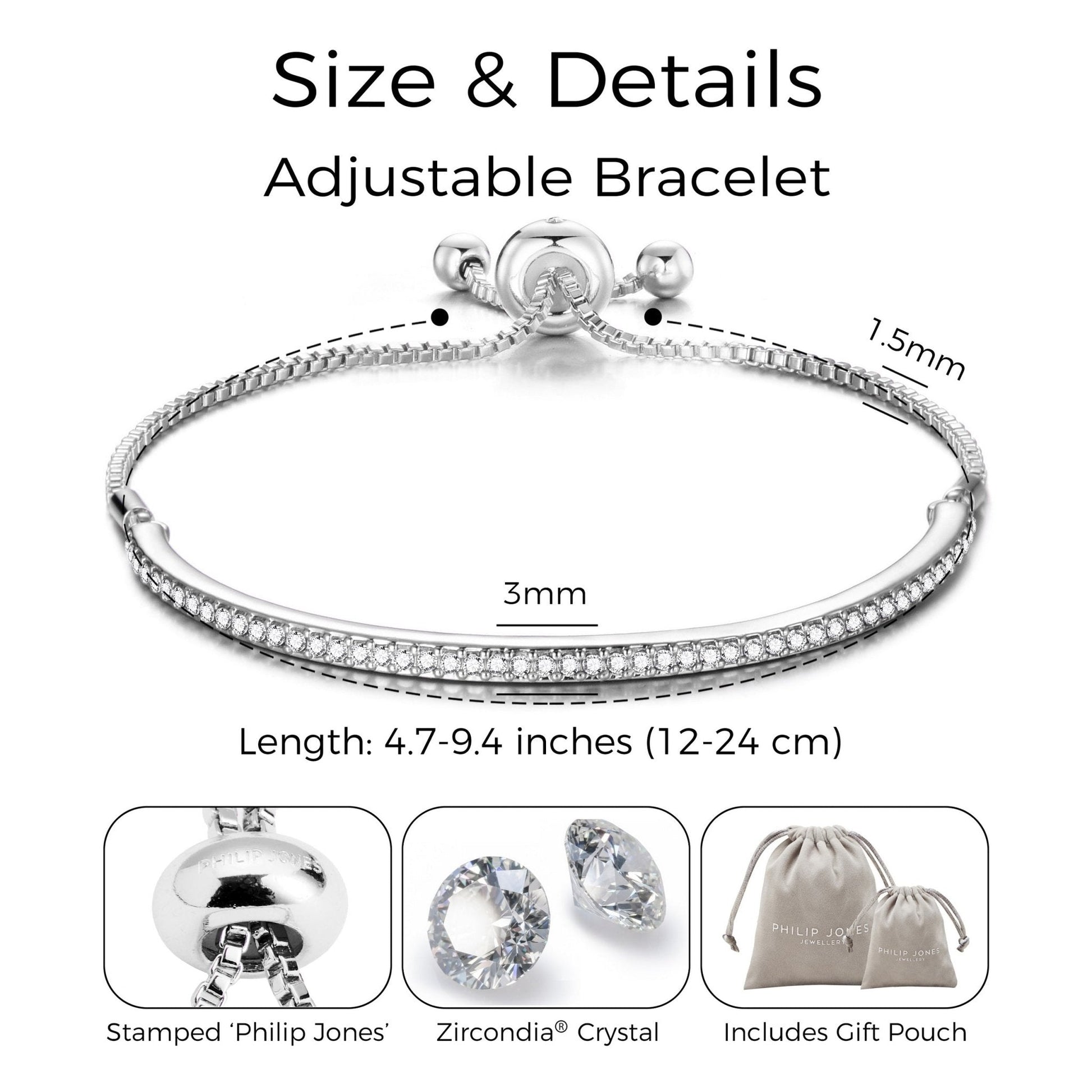 Indulge in this stunning Silver Plated Friendship Bracelet, adorned with sparkling Zircondia® Crystals that add a touch of elegance. Hypoallergenic and made with high-quality materials, this adjustable 12cm to 24cm bracelet is perfect for any wrist size. The slider closure and gift pouch packaging make it a perfect gift for any occasion.