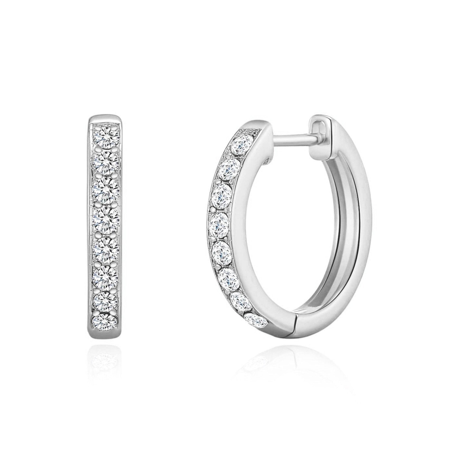 Shine bright with our Silver Plated Hoop Earrings, featuring Zircondia® Crystals. Hypoallergenic and made with a brass alloy base, these hoops are both stylish and gentle on sensitive skin. The huggie closure keeps them securely in place, while the 3mm thickness adds dimension. Packaged in a gift pouch, these earrings make the perfect present.