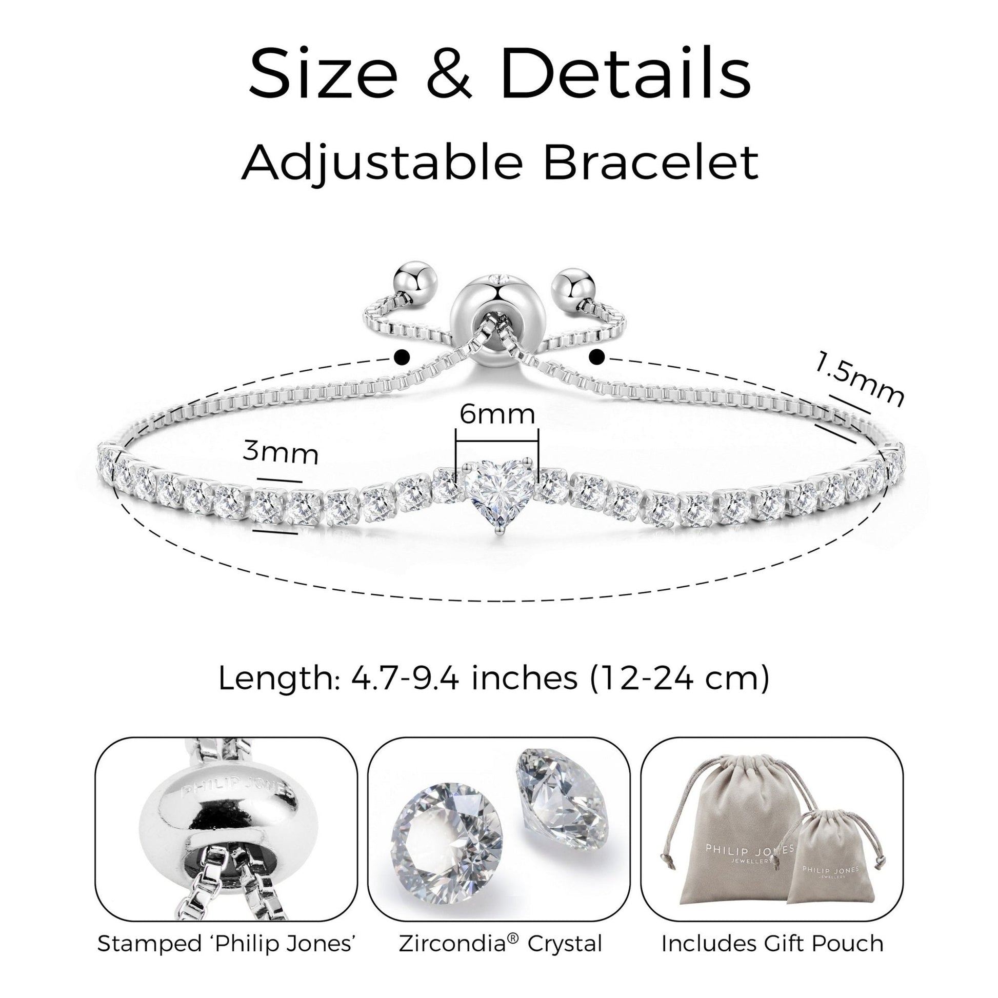This silver-plated friendship bracelet, crafted with hypoallergenic brass alloy and sparkling Zircondia® crystals, is the perfect wedding accessory. Featuring a clear 6mm heart solitaire crystal and 26 smaller round crystals, it adds elegant sparkle for brides, bridesmaids, and bridal celebrations. Adjustable from 12cm to 24cm with a slider closure, it ensures a comfortable fit for every wrist. Lightweight and beautifully presented in a gift pouch with a heartfelt quote card, this bracelet is an ideal bridal or bridesmaid gift to cherish on your special day.