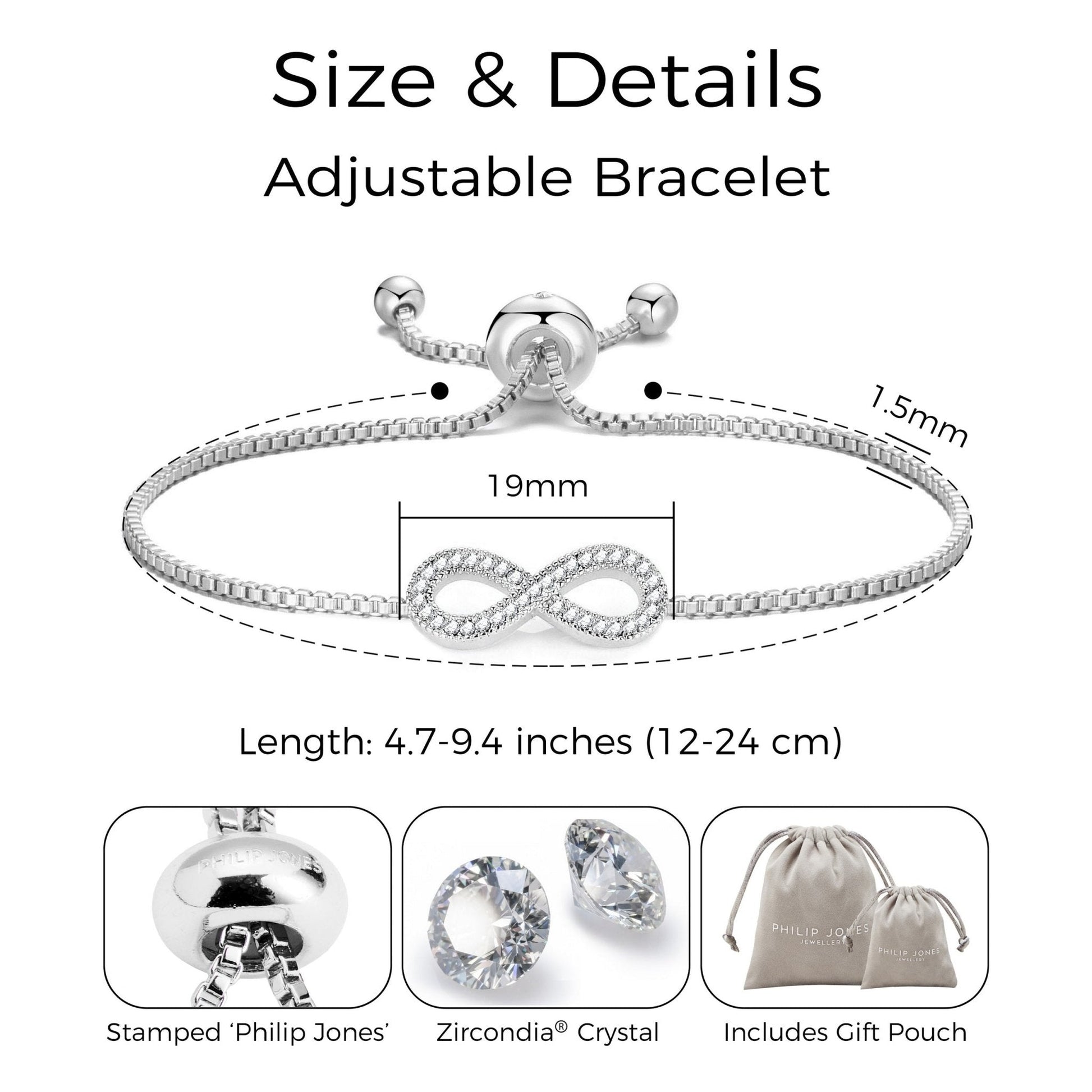 Indulge in the luxurious sparkle of this Silver Plated Infinity Friendship Bracelet created with Zircondia® Crystals! Crafted from an exquisite brass alloy and designed to be hypoallergenic, this stylish bracelet features a sparkling array of 36 clear crystals from Zircondia®, sure to dazzle and delight. Offered in a gift pouch, it's the perfect present for a special person!