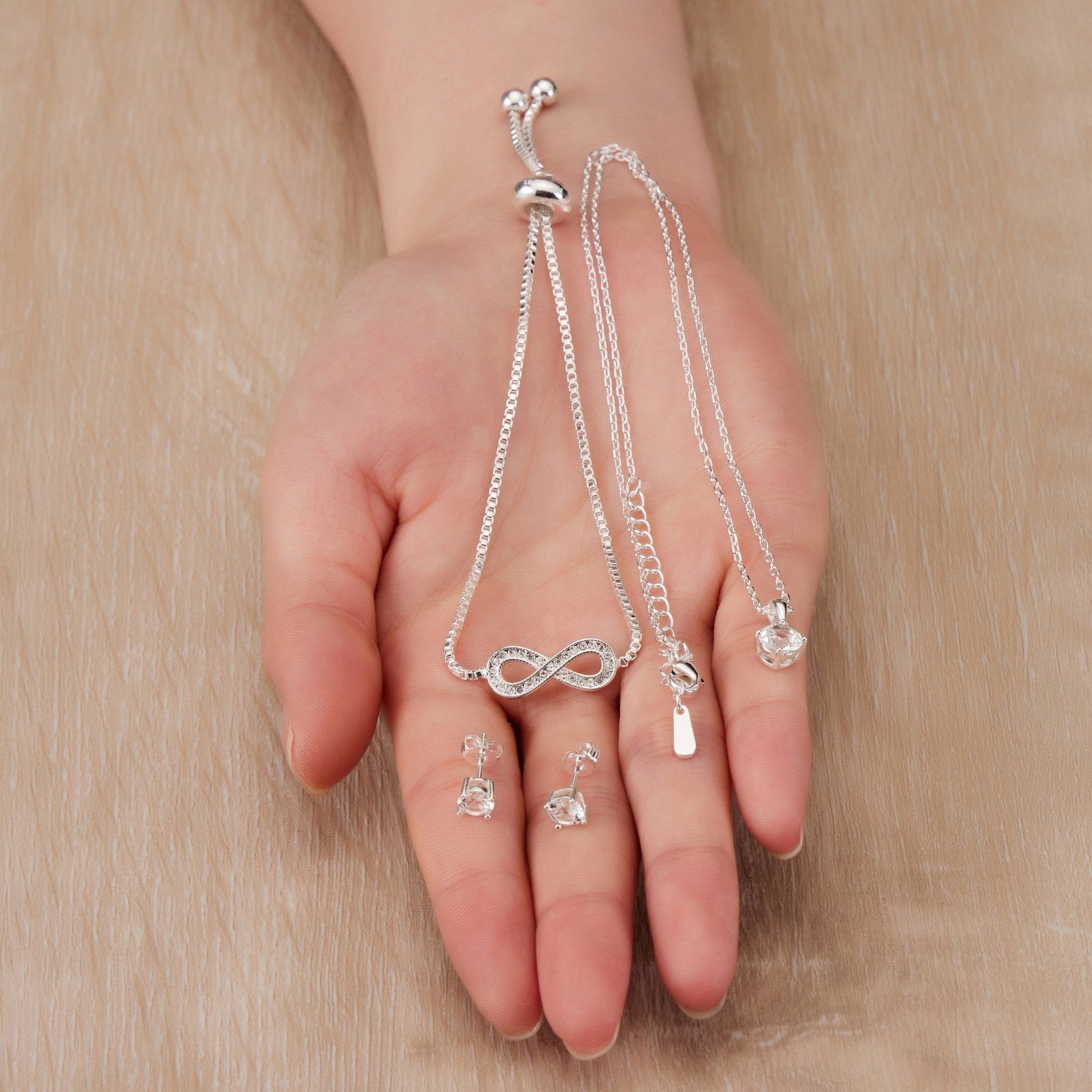 Introducing the Silver Plated Infinity Friendship Set, from premier international design house Philip Jones. Crafted from the finest brass alloy and plated in silver, this stunning set includes earrings, a necklace, and a bracelet. Its delicate design is accentuated by 36 clear Zircondia® crystals, giving you a classy yet timeless look. A special gift for special friends.