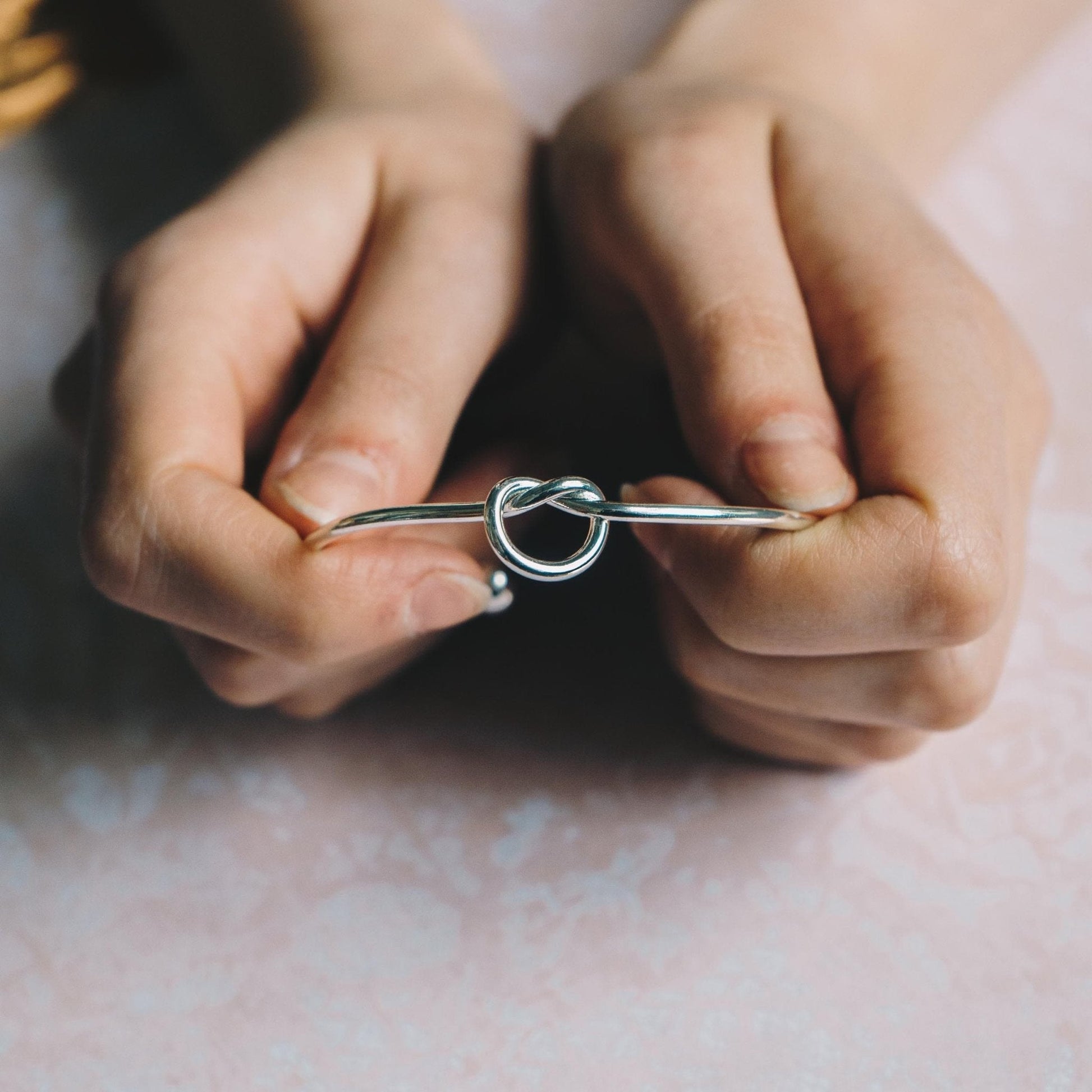 Wrap your wrist in love with our Silver Plated Love Knot Cuff Bangle. The high polished finish adds a touch of elegance while the hypoallergenic material ensures all day comfort. With a stretch design and secure cuff closure, this bangle is perfect for any size wrist. Comes in a gift pouch for easy gifting.