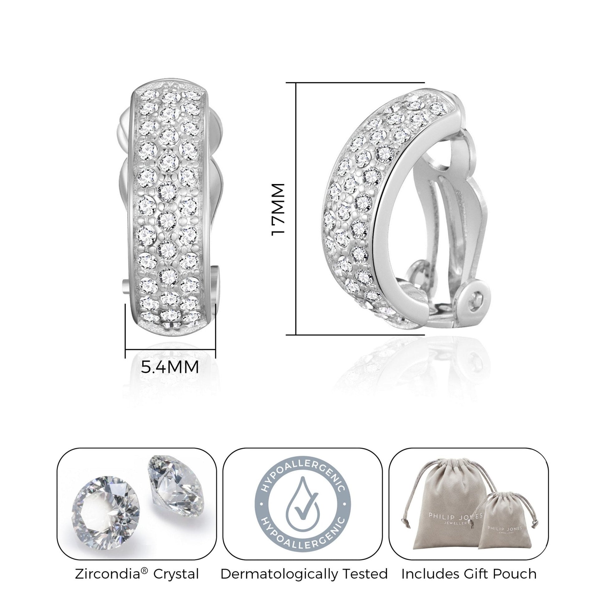Philip Jones' silver plated brass alloy clip-on earrings, boasting 17mm height and 5.4mm width, are the perfect statement piece! With a weight of 4.3g, these beauties are bedazzled with dazzling 1mm crystals from Zircondia®, making them sparkle in a clear, round shape. They're made up of 66 stones, to put the finishing touch on your look.