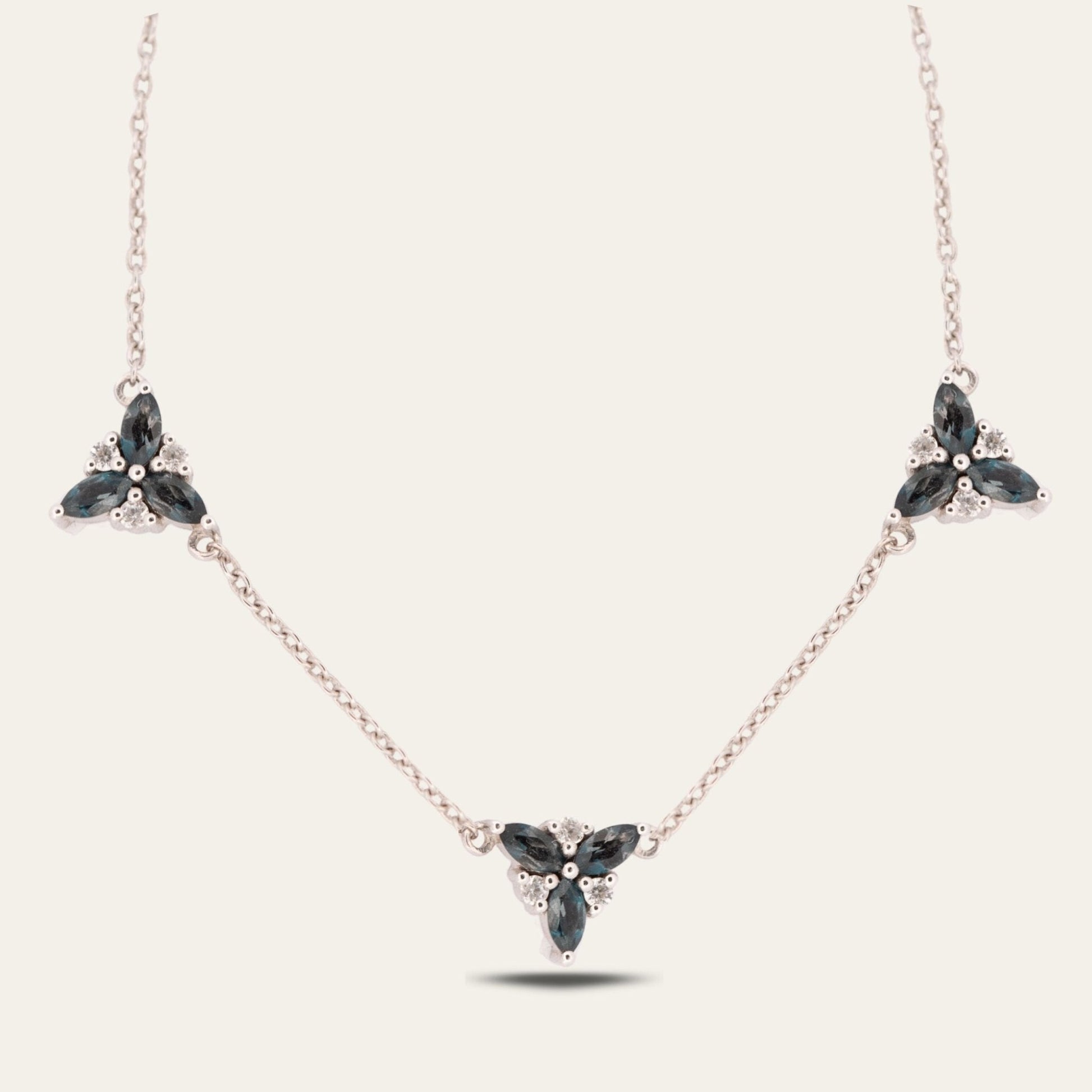 Named after Galene, the enchanting Greek goddess of calm seas, this exquisite necklace has three graceful clusters of London Blue Topaz gemstones delicately arranged in marquise settings, reminiscent of gentle waves catching moonlight. We have then added sparkling white topaz gemstones that sparkle with every movement.