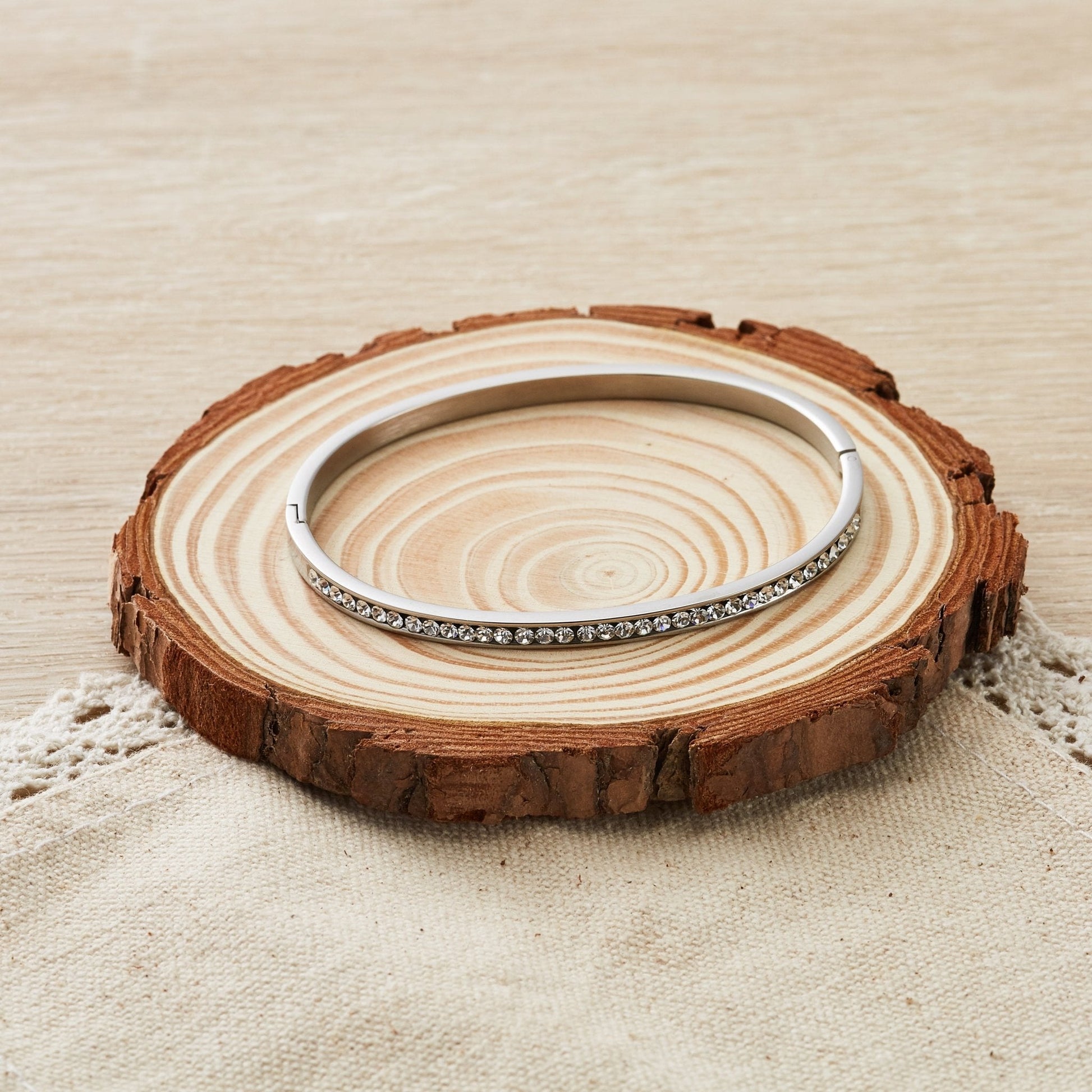 Flaunt your style with this glistening Stainless Steel Channel Set Bangle made with shimmering Zircondia® Crystals! Crafted of hypoallergenic stainless steel, this bangle measures 6.3cm in diameter and 4mm thick. It securely closes with a hinged closure and weighs 13g. An array of 34 round, clear crystals adorn the piece. We'll deliver it in a stunning gift pouch measuring 10cm x 9cm. Make it yours today!