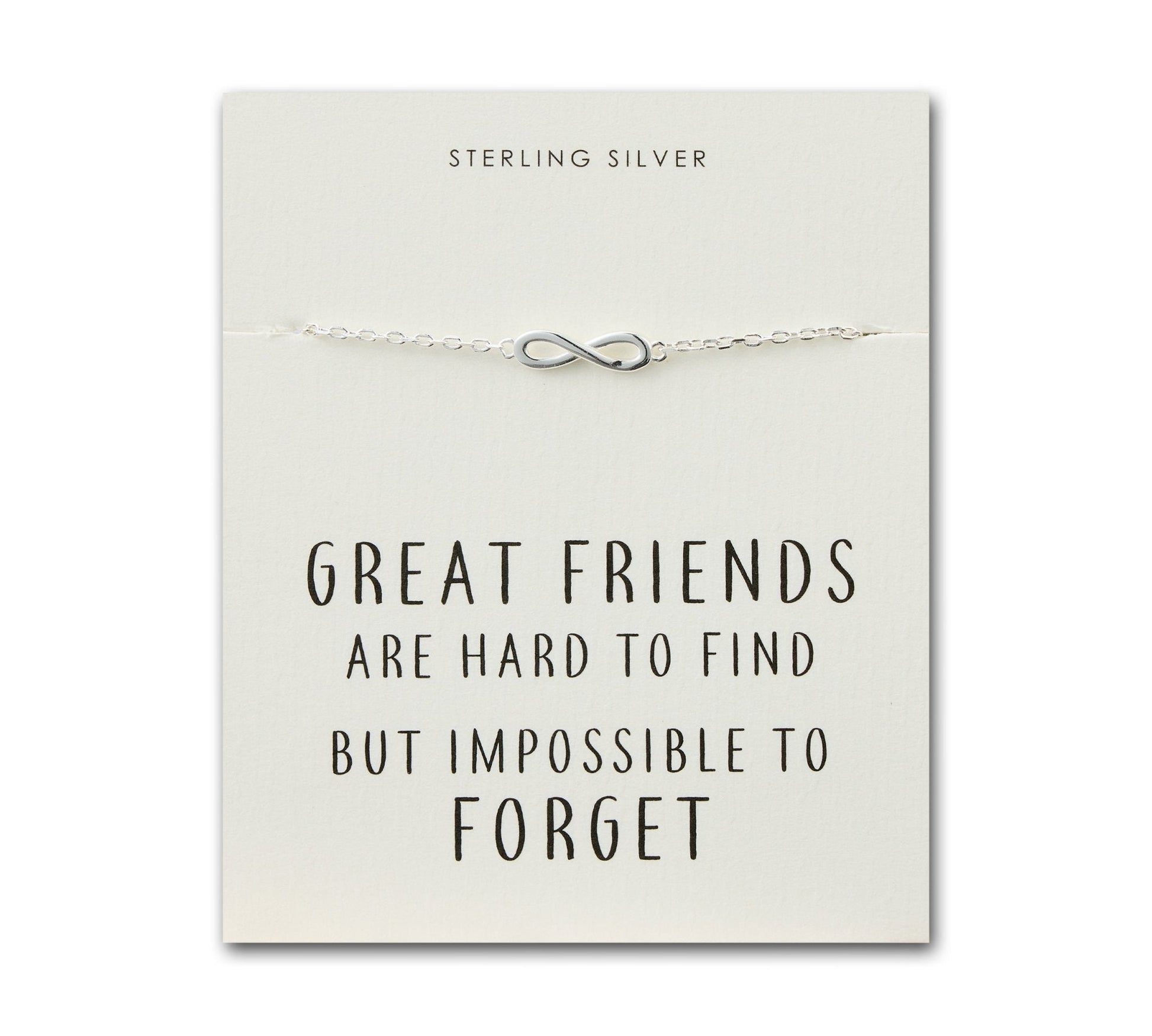 Experience the infinite bond of friendship with our Sterling Silver Friendship Quote Infinity Bracelet. Made from stamped 925 Sterling Silver, this hypoallergenic chain link bracelet features an infinity symbol measuring 13.5mm (W) x 4.1mm (H). With a secure lobster claw closure and a weight of 1.5g, it comes beautifully packaged in a gift pouch with an inspiring quote card.