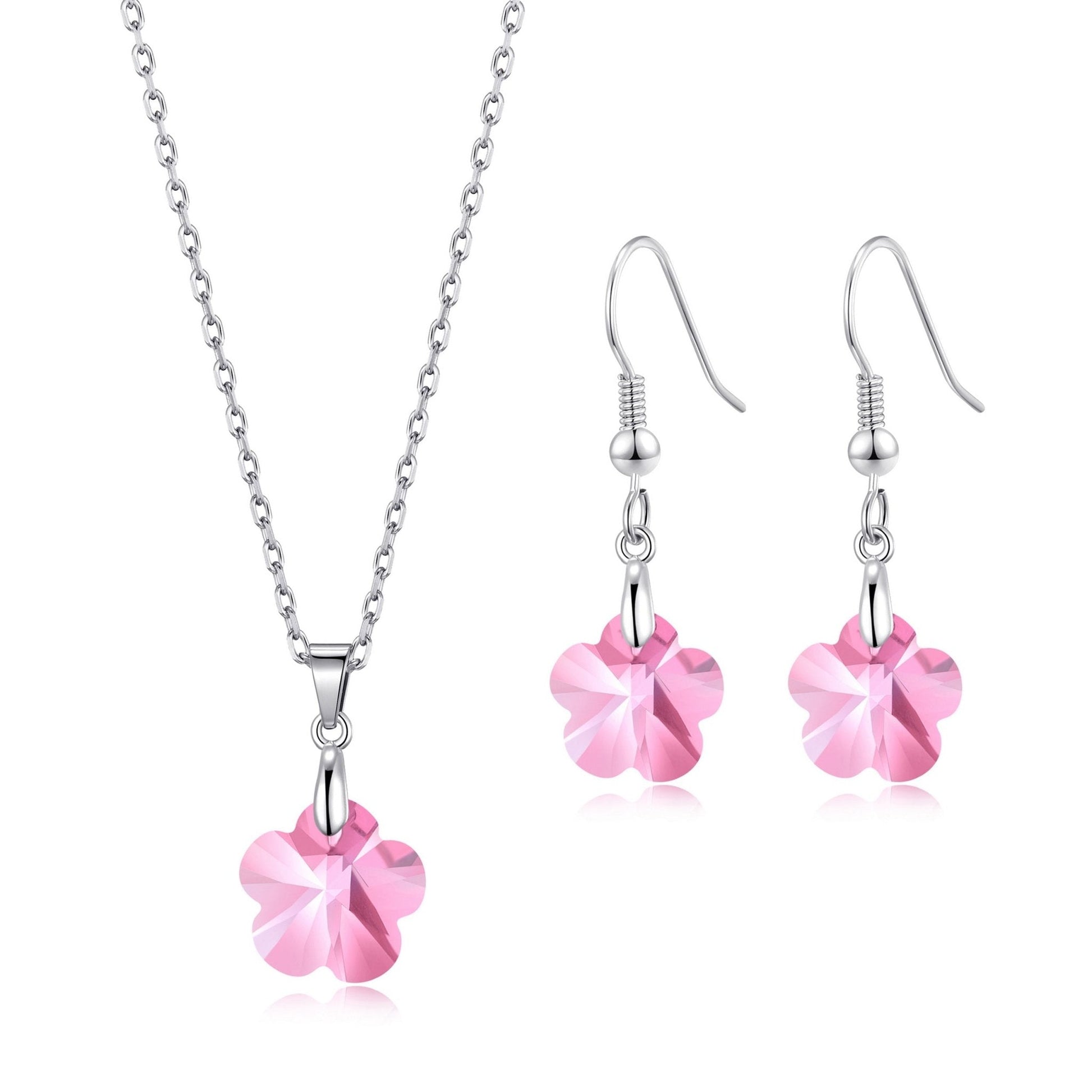 Crafted with Zircondia® Crystals and sterling silver, this light rose flower set adds a beautiful touch of elegance to your look. Hypoallergenic and stamped 925, the drop earrings measure 34mm (H) x 10mm (W) with 10mm flower shapes, while the pendant is 12mm and hangs from a 43 cm + 5cm extender chain. Comes with a gift pouch for an extra special presentation.