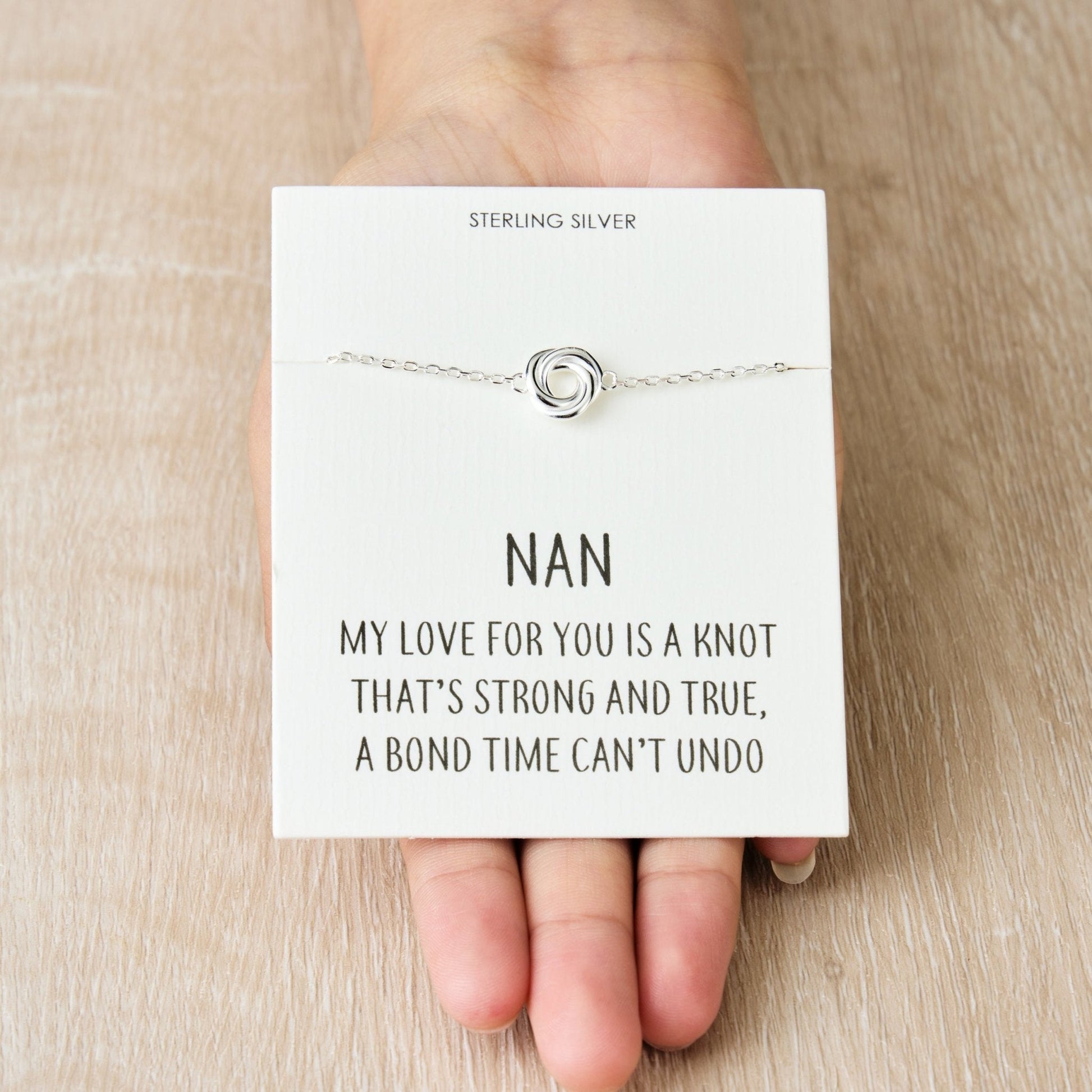 Experience the value of the Philip Jones Sterling Silver Nan Quote Knot Bracelet, made from hypoallergenic, stamped 925 sterling silver. This stunning piece features a delicate chain link design with dimensions of 10.5mm (H) x 10.5mm (W), and measures 17.8cm with an additional 2.5cm extender. The closure is a secure lobster claw and the weight is 2.4g, perfect for everyday wear. Packaged in a charming gift pouch with a meaningful quote card, this bracelet is sure to inspire and delight.