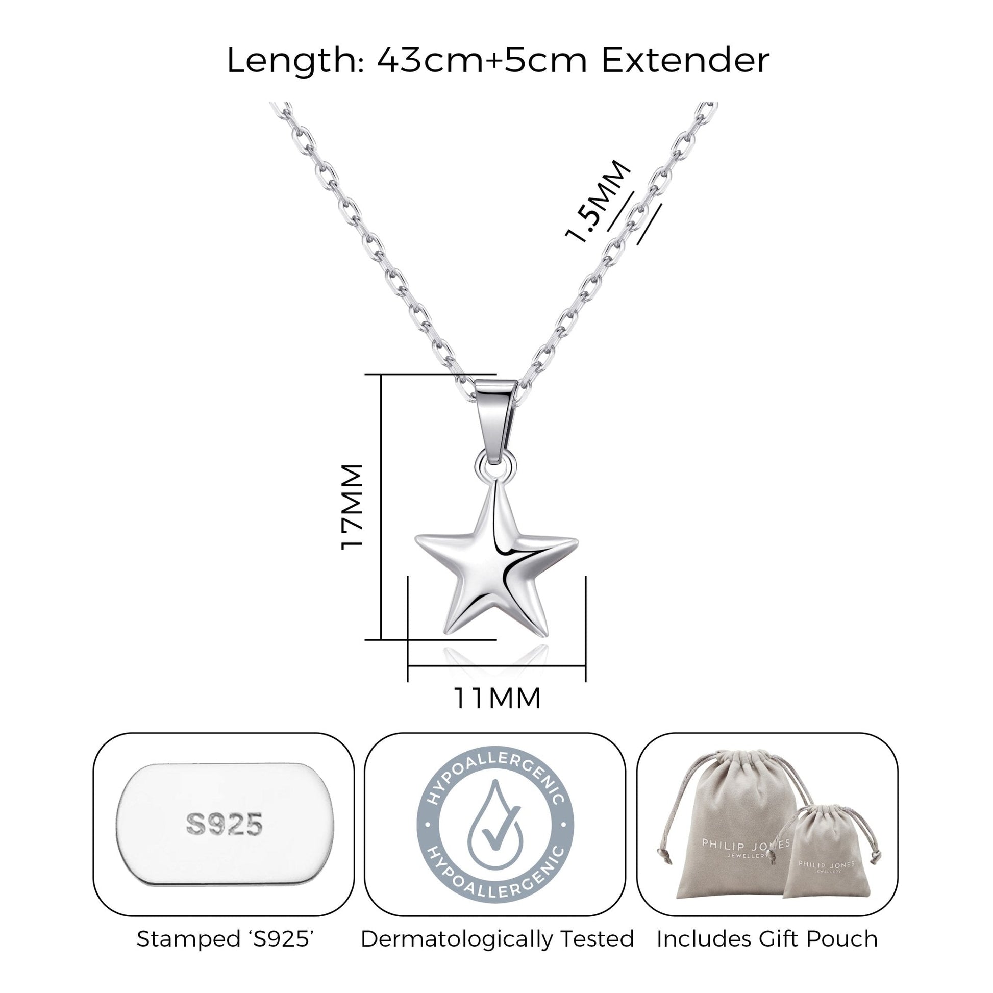 This Sterling Silver Star Pendant Necklace is the perfect way to show your style and grace. Crafted from hypoallergenic Sterling Silver, it's stamped with 925 for exquisite quality. Its 17mm height and 11mm width make it a captivating addition to your wardrobe. Delivered in its own gift pouch, it's ready to charm. Wear it - Love it!