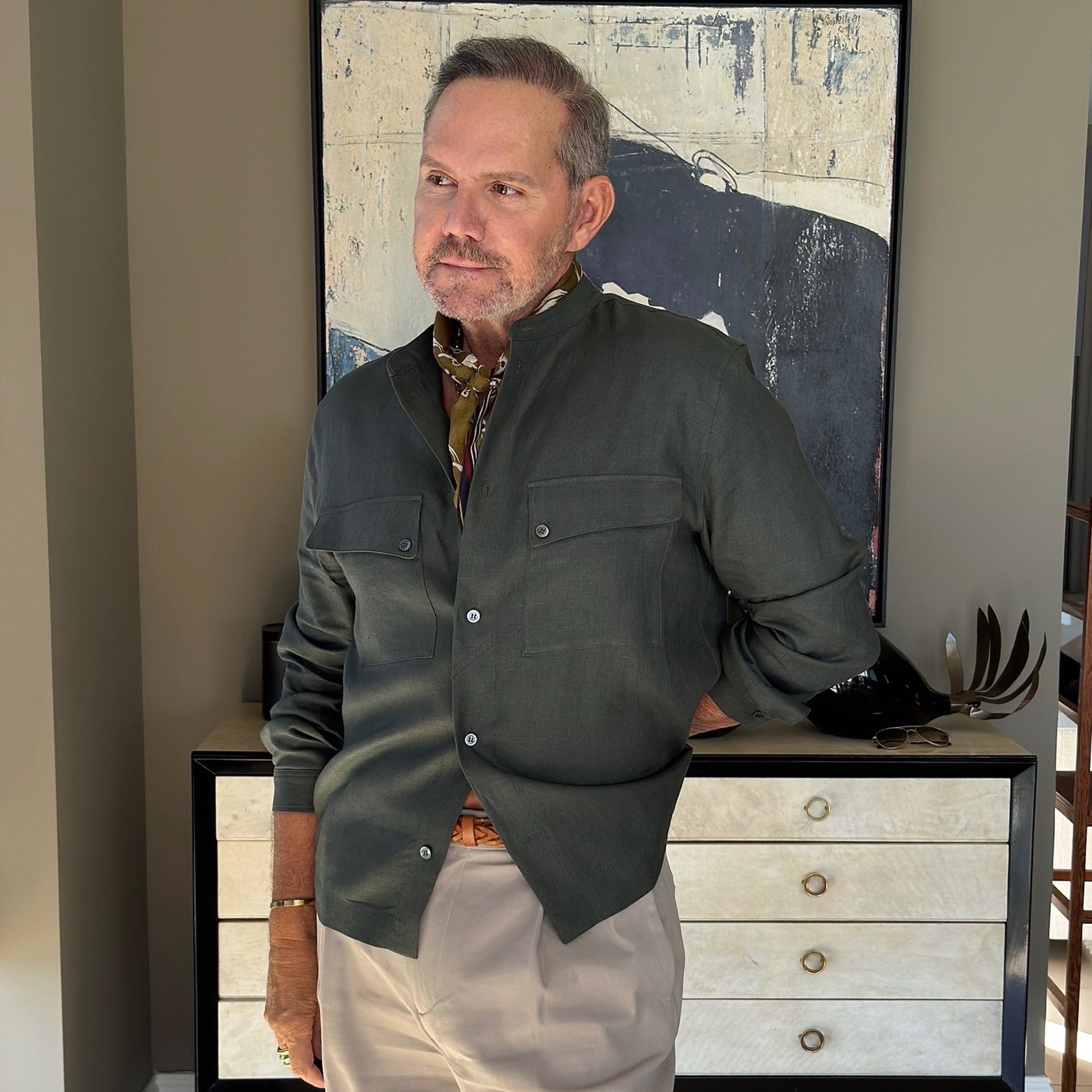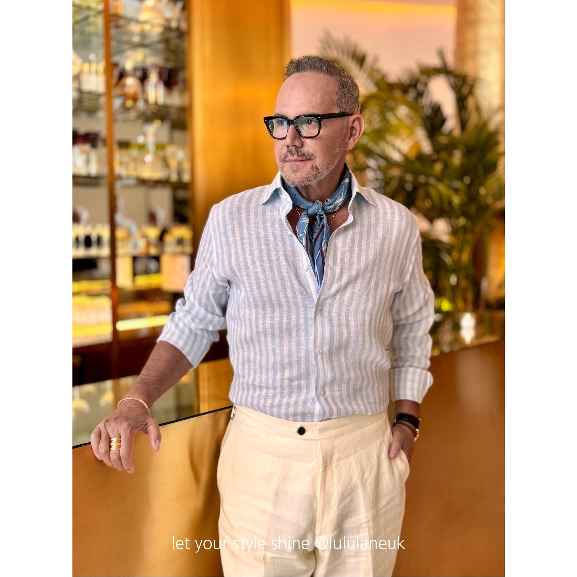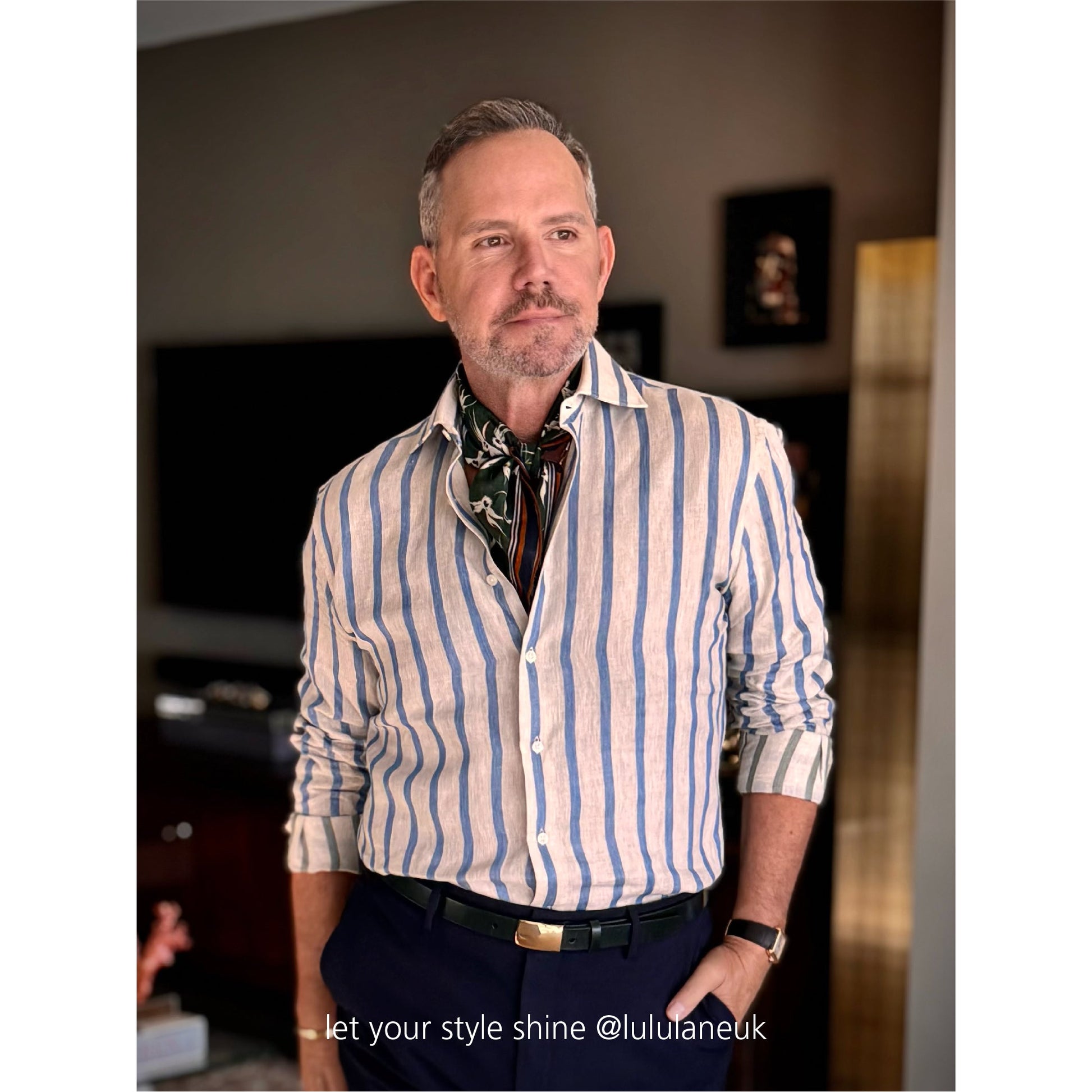 The subtle colour palette—sky blue, green, black, and olive green—adds quiet sophistication, while hand-rolled edgesgive it a refined, artisanal finish. Whether tied loosely around the neck, styled in the hair, or knotted to your bag, this organic cotton silk scarf is made to move effortlessly with your day-to-day looks.