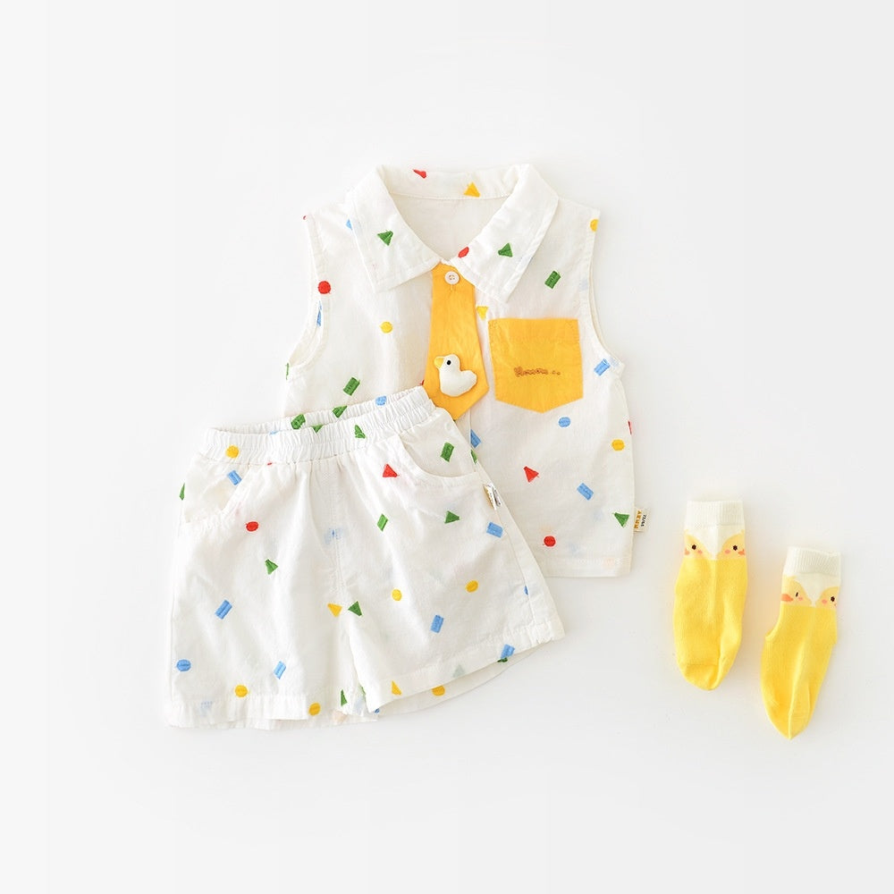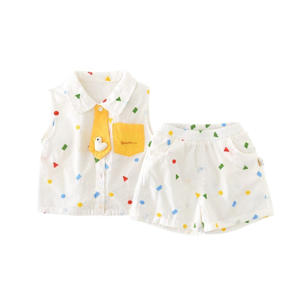 Product information: Color: colorful geometric duck Pants length: Shorts Gift Box content: Clothing Suitable height: 73CM,80cm,90cm,100cm Suit type: blouse and pants Thickness: thin Fabric name: Cotton Closed style: single-breasted Main fabric composition: Cotton Number of suite: two-piece set