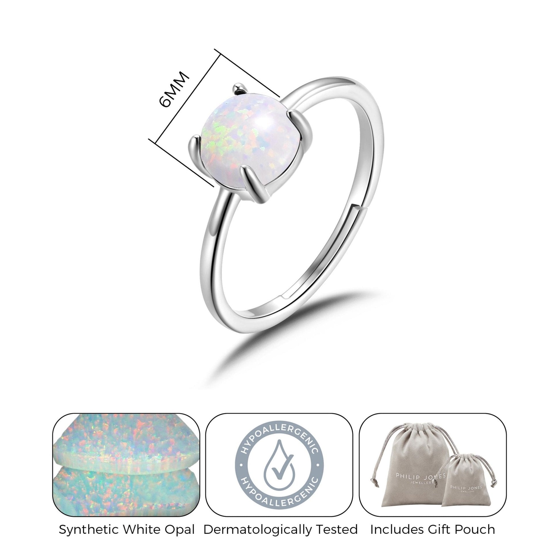 Illuminate your style with our Synthetic White Opal Adjustable Ring by Philip Jones. Made with hypoallergenic silver-plated brass alloy and featuring a dazzling 6mm round white opal, this ring is both elegant and safe for sensitive skin. The adjustable size and lightweight design make it perfect for everyday wear. Comes in a beautiful gift pouch.