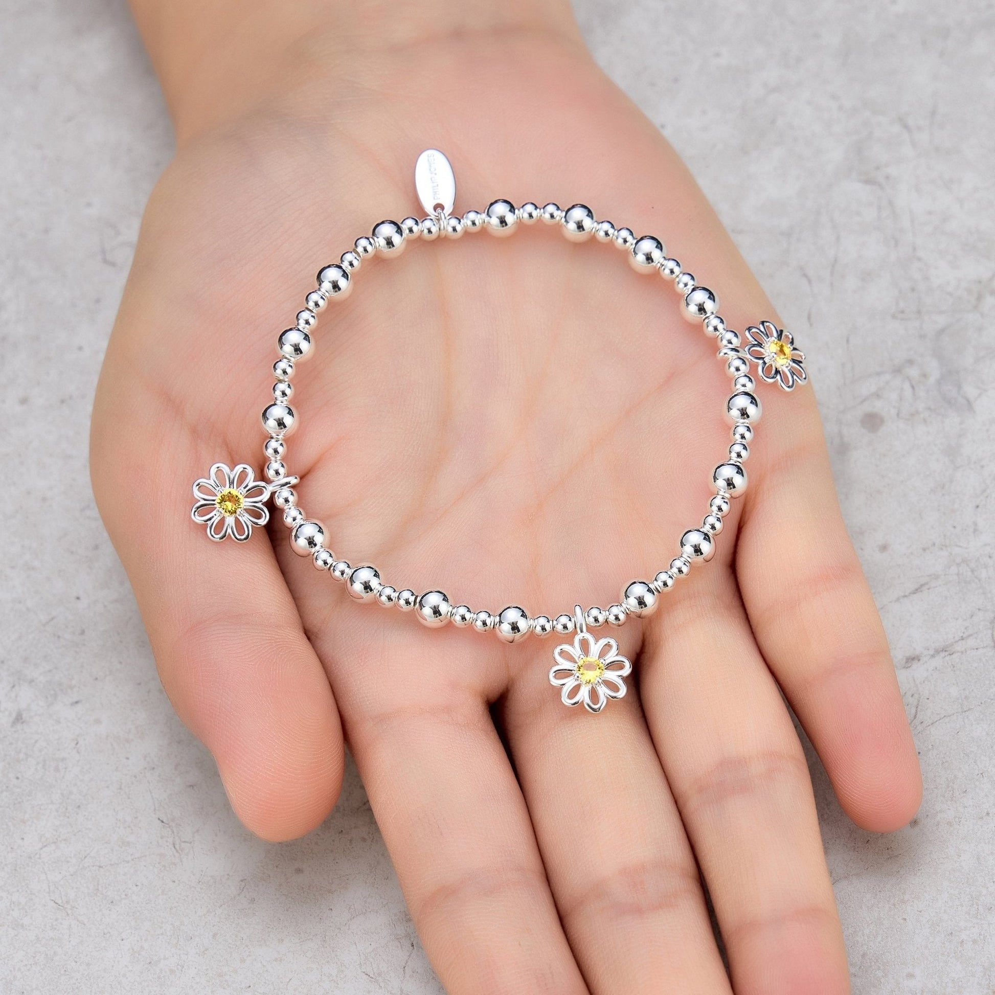 Celebrate growth and gratitude with this elegant Daisy Crystal Beaded Stretch Bracelet. Crafted from silver plated brass and adorned with sparkling Zircondia® crystals, this hypoallergenic bracelet features 3 charming 10mm daisy charms. Its flexible design fits wrists comfortably. It combines delicate beauty with everyday wearability. Presented in a stylish quote gift box, it makes a thoughtful and meaningful gift for someone special.
