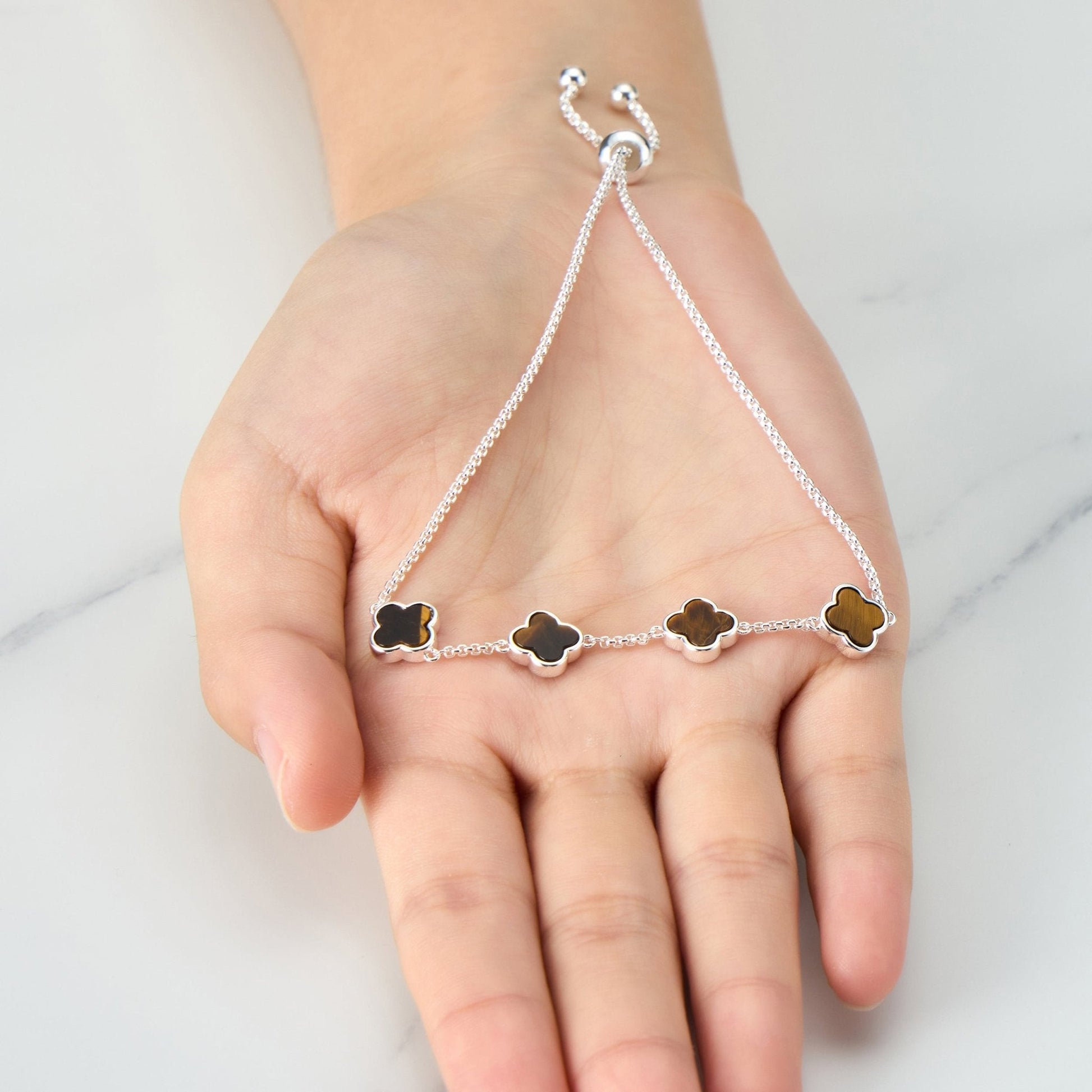 Crafted with authentic gemstones and silver plating, this exquisite bracelet by Philip Jones offers both style and comfort. The delicate clover design, measuring 9.5mm, is hypoallergenic and adjustable, making it suitable for all. The gorgeous brown Tigers Eye stones add a touch of warmth and charm. Comes with a gift pouch.