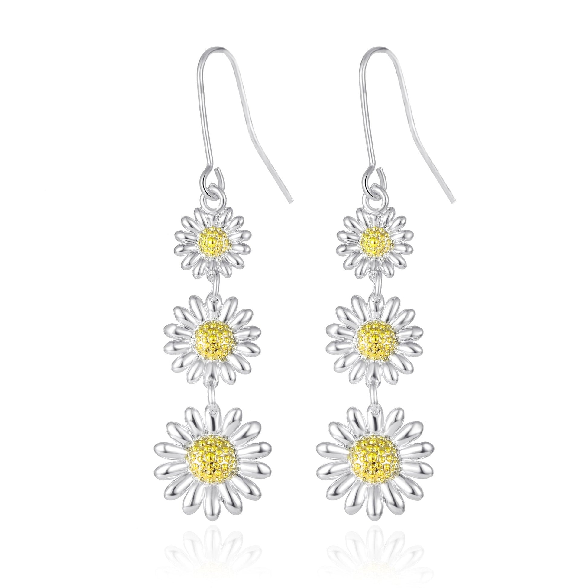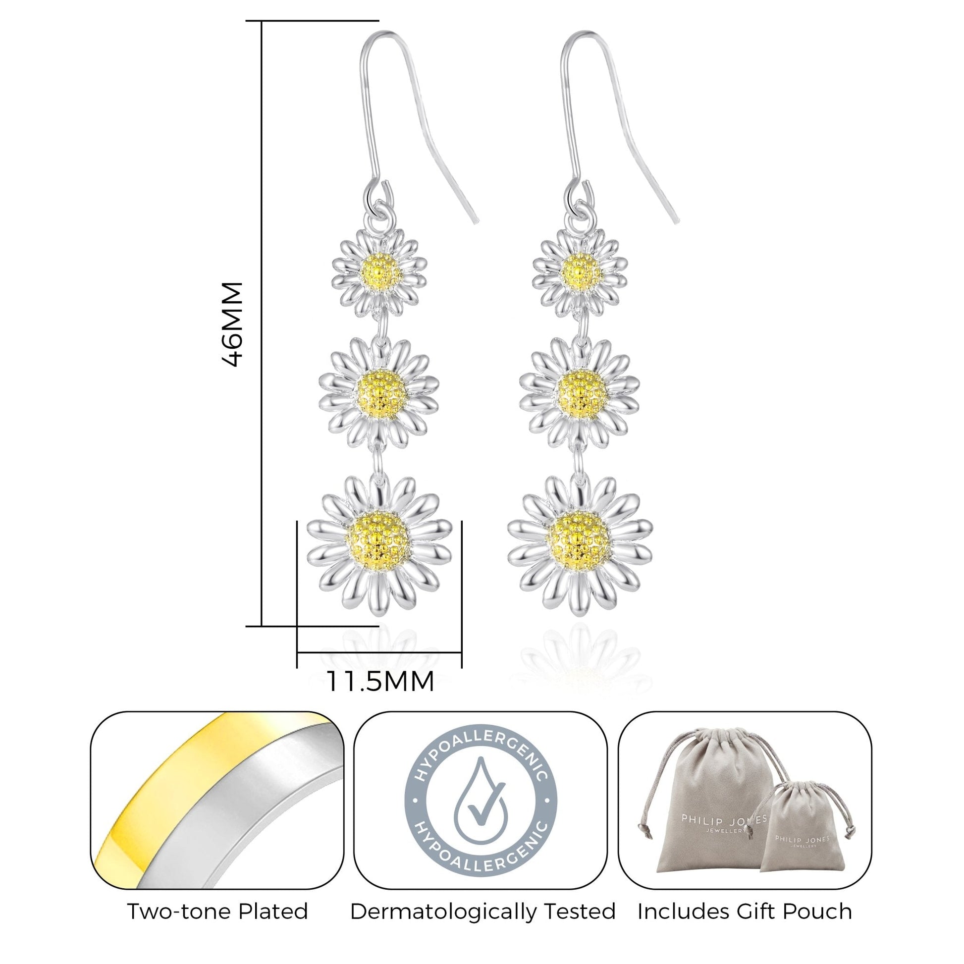 Spoil yourself or someone special with these beautiful Triple Daisy Drop Earrings from Philip Jones. Plated in both silver and gold, these fashionable earrings are crafted from a brass alloy and feature a gorgeous 46mm height and 11.5mm width. For secure closure, these earrings are designed with a French hook and weigh just 4.6g.