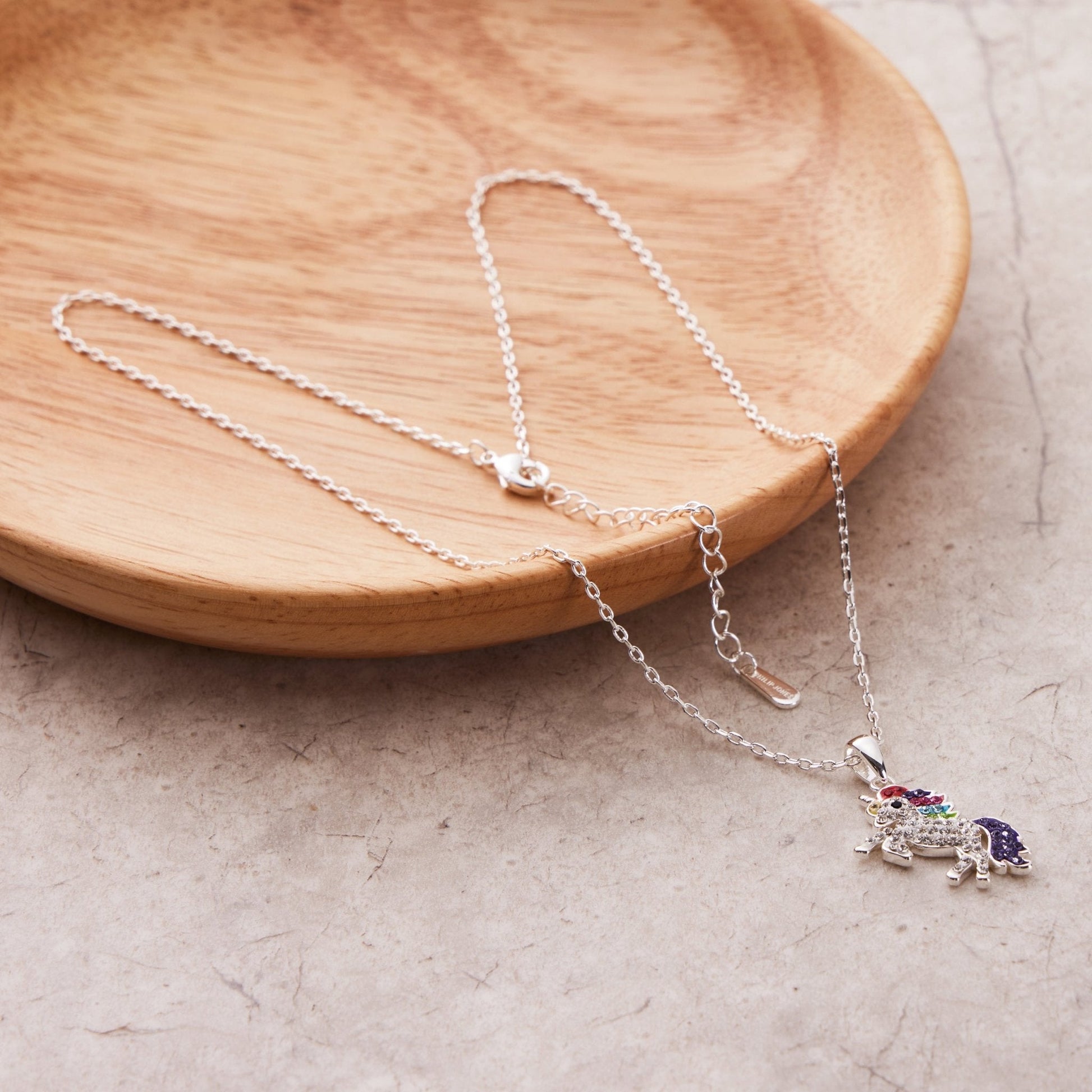 This enchanting Unicorn Necklace from Philip Jones features a silver-plated brass pendant adorned with sparkling Zircondia® crystals in assorted colours. Measuring 29mm by 16mm, it hangs delicately on a 40cm cable chain with a 5cm extender for the perfect fit. Lightweight at just 4.8g, it secures with a lobster claw clasp and arrives beautifully presented in a gift pouch. A magical accessory that adds a touch of whimsy and elegance to any outfit.