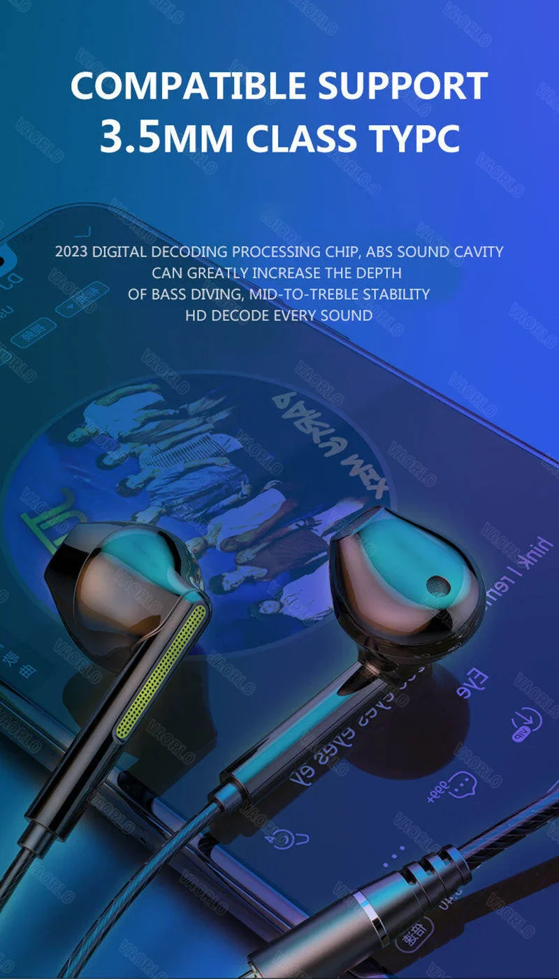 VAORLO 3.5mm/Type-C Wired Headphones Heavy Bass In Ear Earphone With Mic USB C Stereo Earbuds Gaming Headset For Samsung iPhone