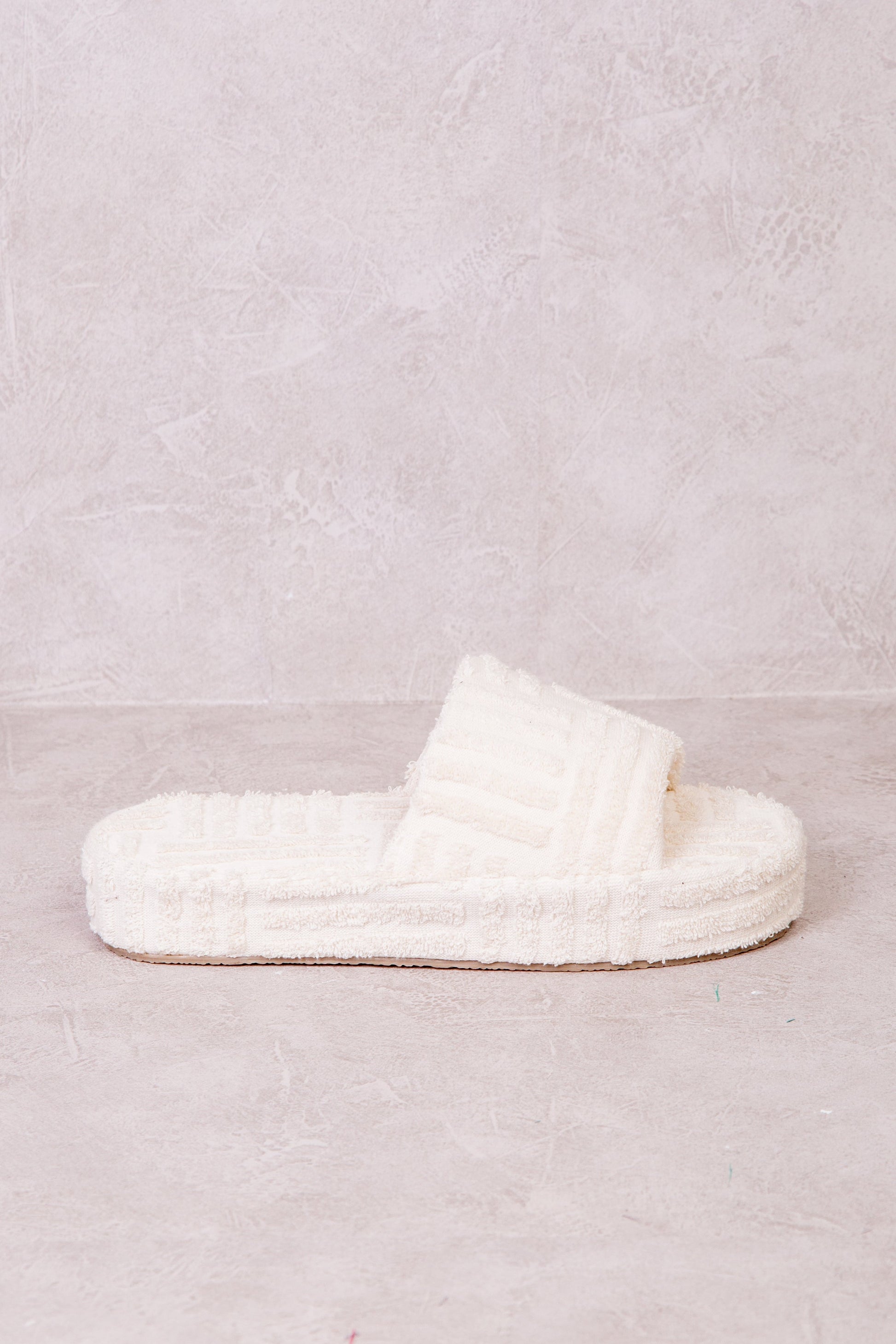 VESPA TERRY TOWEL FABRIC FLATFORM SLIDER IN IVORY CREAM