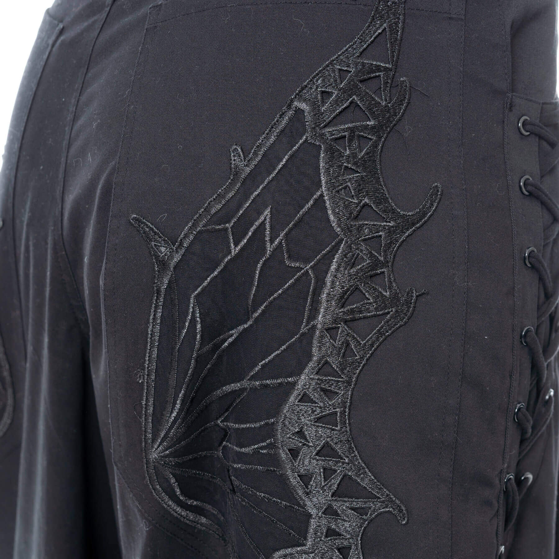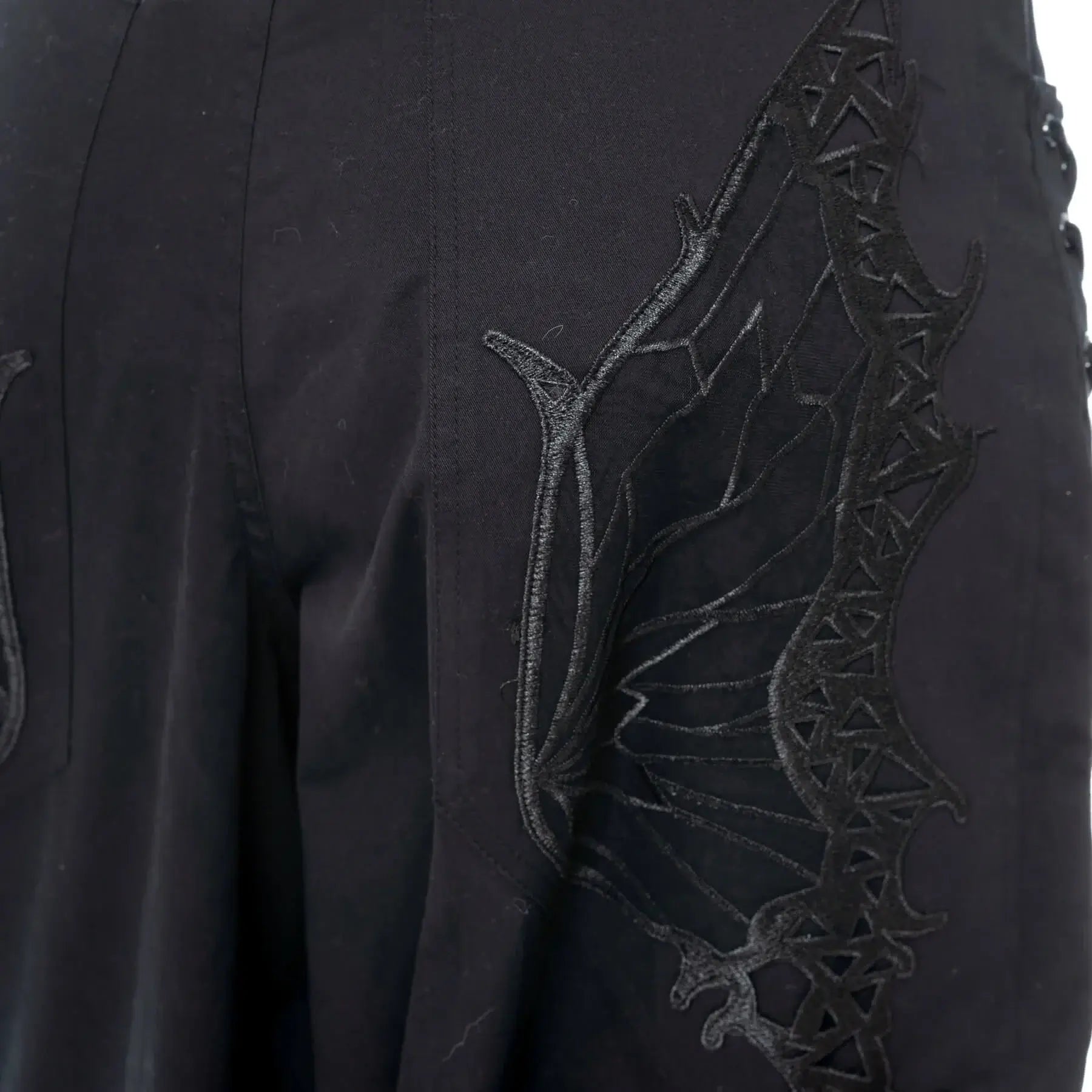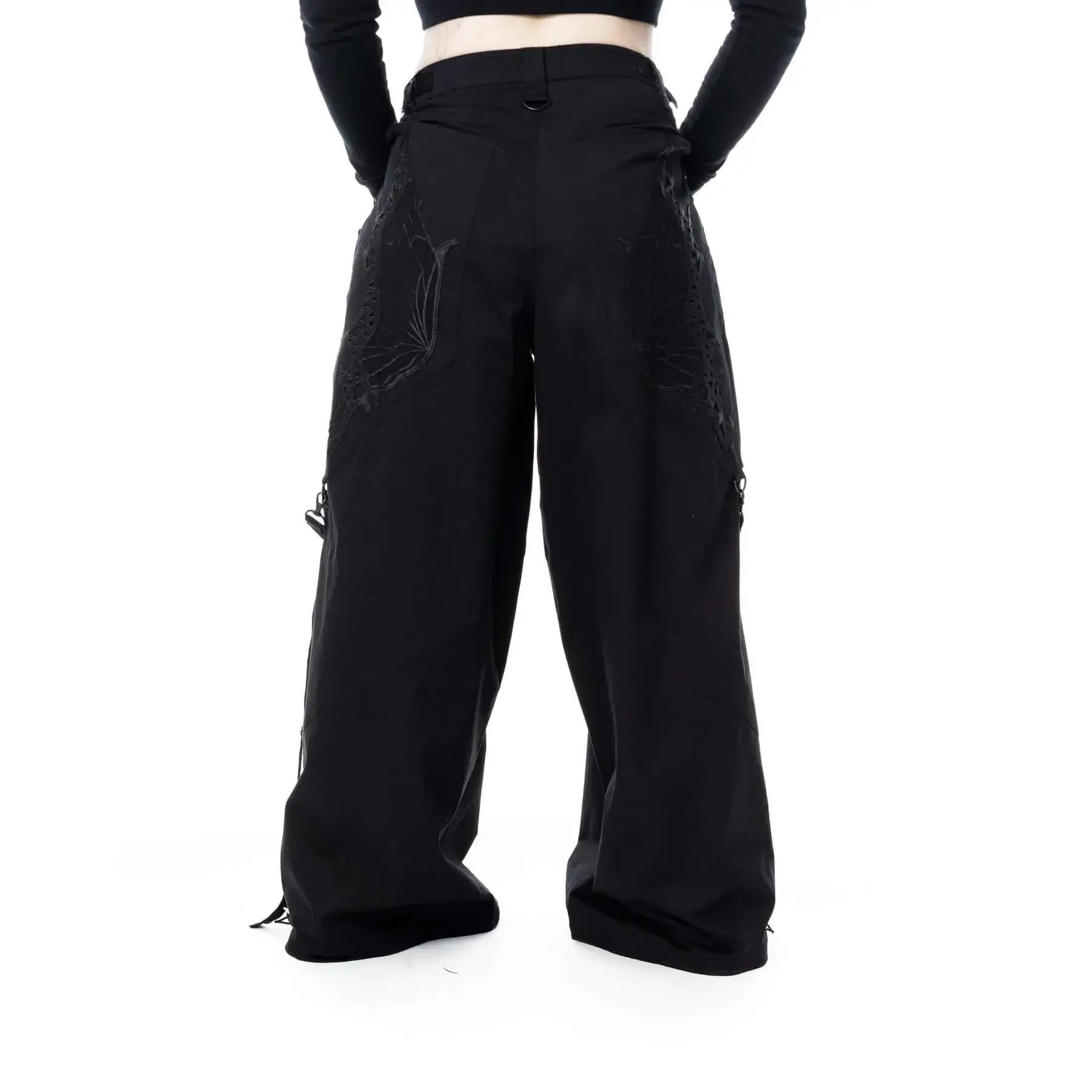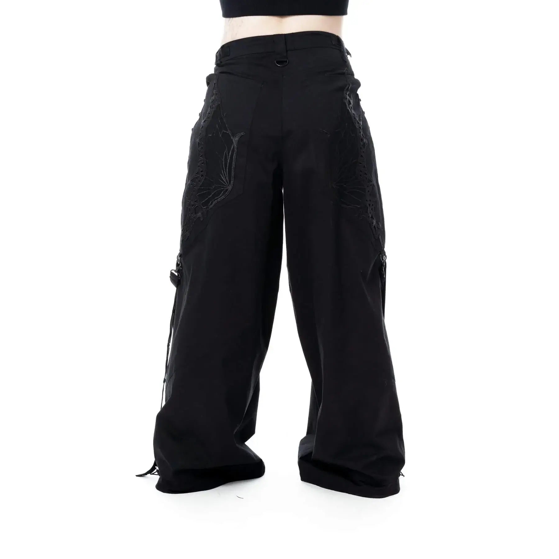 Upgrade your alternative streetwear game with our Vixxsin Mariposa Pants Ladies. These black wide-leg pants feature a high-waisted fit with a tailored look and oversized silhouette for a dramatic, edgy vibe. Embroidered butterfly wing designs and functional hardware details add a unique gothic touch. Adjust the hems and pair with platform boots for a customized, standout look.