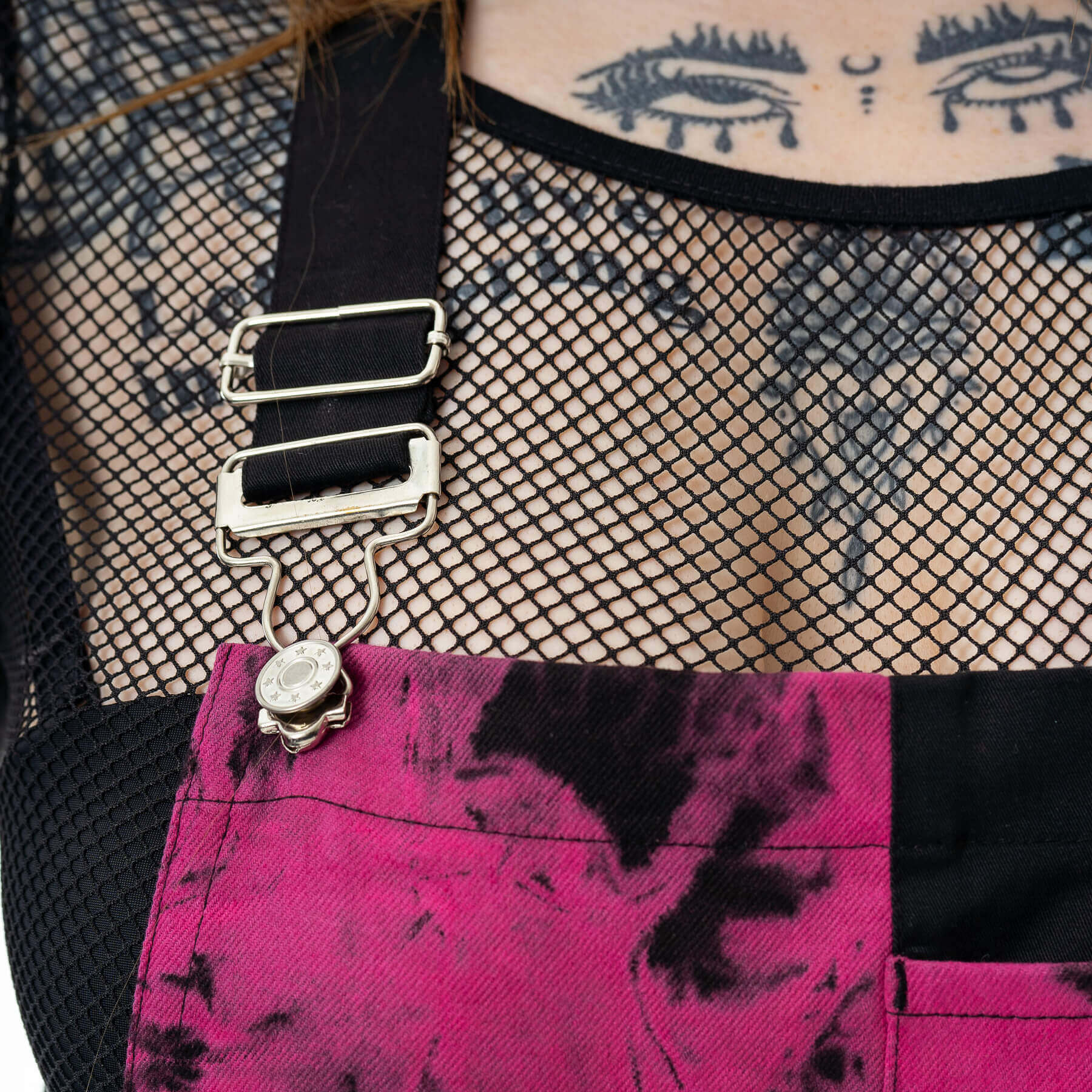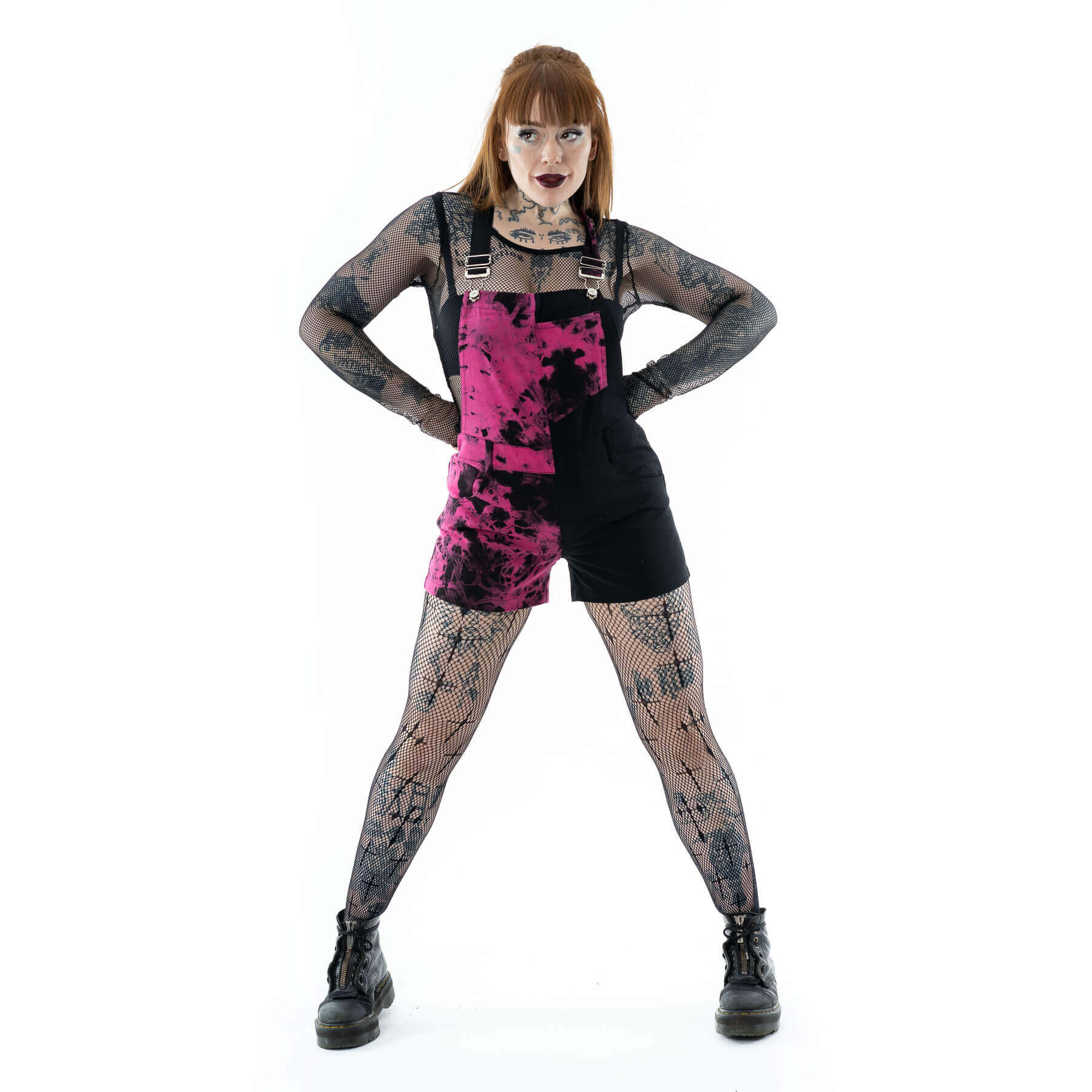 Add some edge to your wardrobe with the Vixxsin Petra Dungarees. These bold and asymmetrical dungarees feature a unique split design, with one side in solid black and the other showcasing a vibrant pink and black tie-dye pattern. The adjustable straps and utilitarian buckle fastenings add an unexpected touch to this edgy, alternative style.