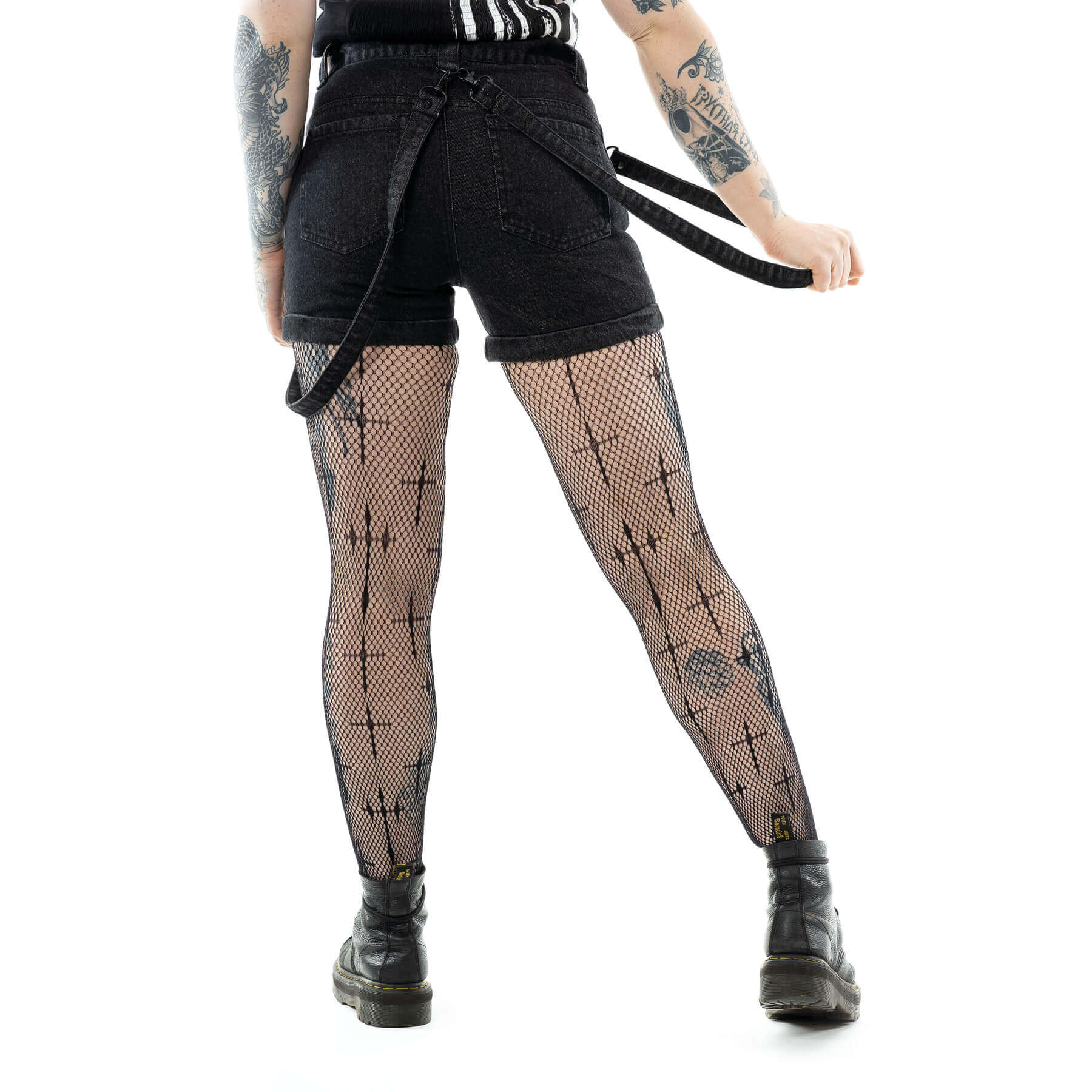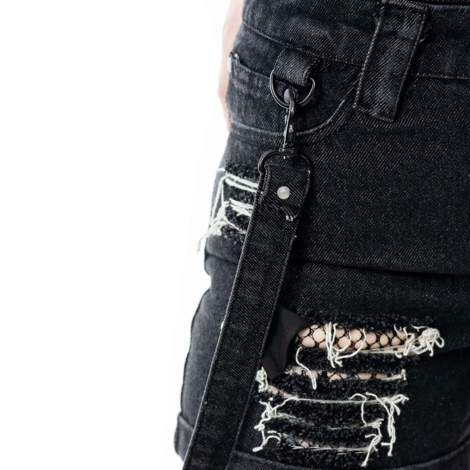 Rock out in these edgy Vixxsin Undead Shorts. With a black stonewash finish and ripped distressing, these high-waisted denim shorts bring a punk and gothic vibe. The cuffed hem and five-pocket styling add a touch of structure to the rugged look. Perfect for standing out in a crowd and showing off your unique style!