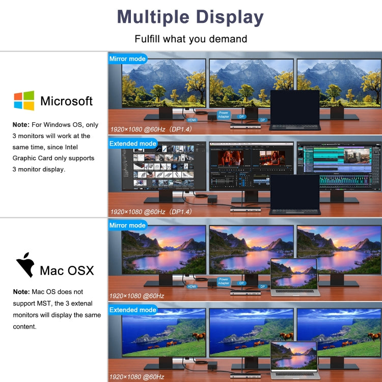Contains 2 x DP1.4 ports, 1 x HD 2.0 port, a Gigabit Ethernet port, a 3.5mm audio port, 4 x USB3.0 ports, a SD/TF card slot, a collection of 11 interfaces, greatly supplementing the ultra-thin notebook ports, to meet the office, creativity, life, entertainment, a variety of needs. Capable of simultaneous screen expansion or triple display, it is suitable for notebooks with full-featured Type-C or Thunderbolt 3/4 ports. This product is suitable for scenarios that require multiple displays such as meetings, design, programming, stock chart analysis, classrooms, and more.
