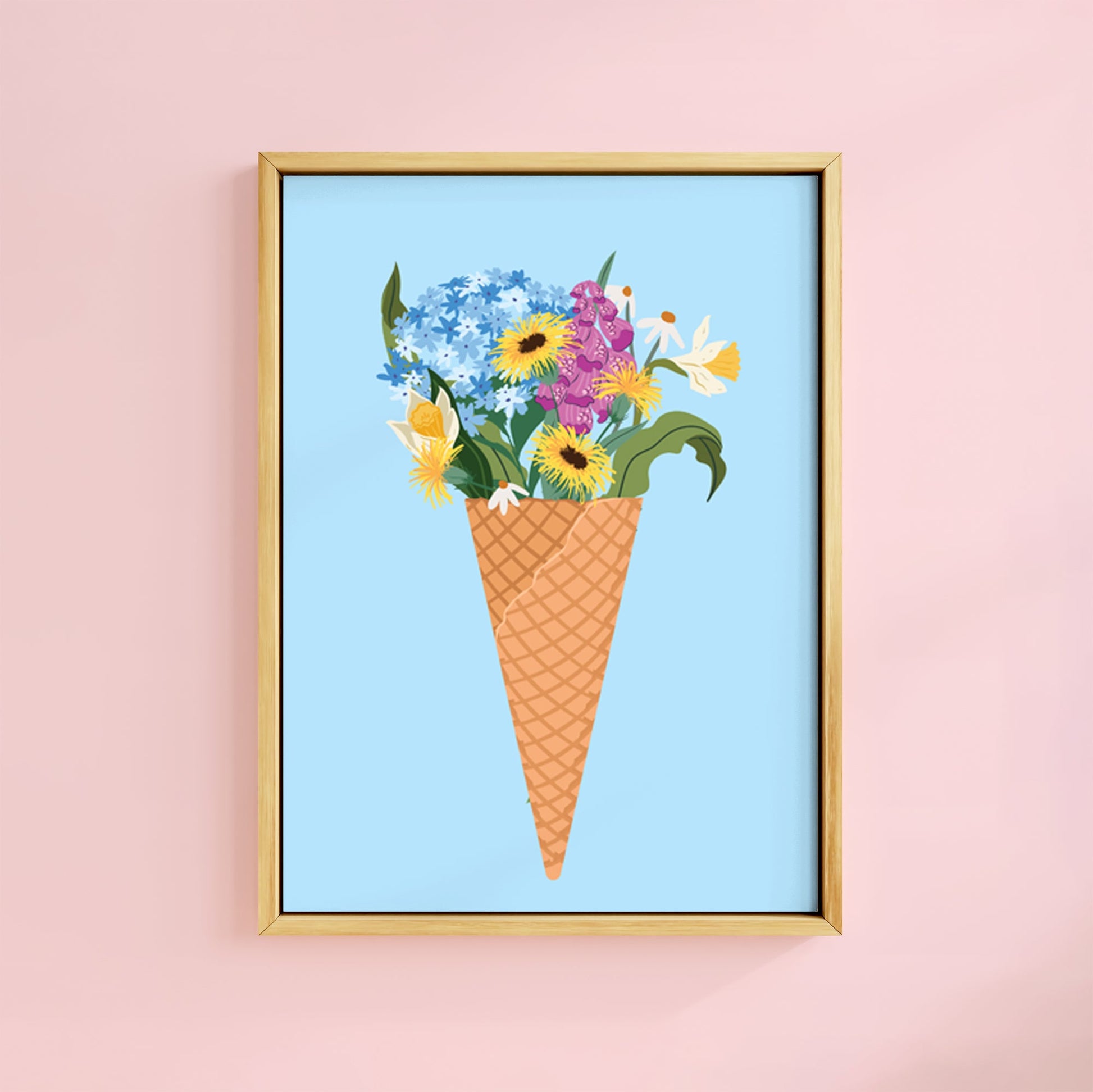 Celebrate the sun coming back with this delightful Wildflower bloom ice cream cone print! With it's bright pastel hue background, waffle cone and a bunch of Wildflowers fresh from our cottage garden. A lovely fun print which is suitable for any room in your home.